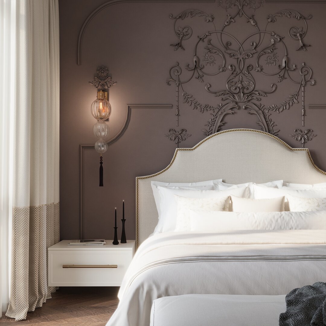 Один из проектов студии — спальня в квартире на Лученка. Здесь использовали разноуровневое освещение: подсветили барельеф за изголовьем кровати, чтобы добавить глубины, выбрали подвесные светильники у кровати для уютной атмосферы. А вместо обычной люстры в центре комнаты теперь «плывёт» лёгкое облако, наполняющее пространство мягким рассеянным светом.
