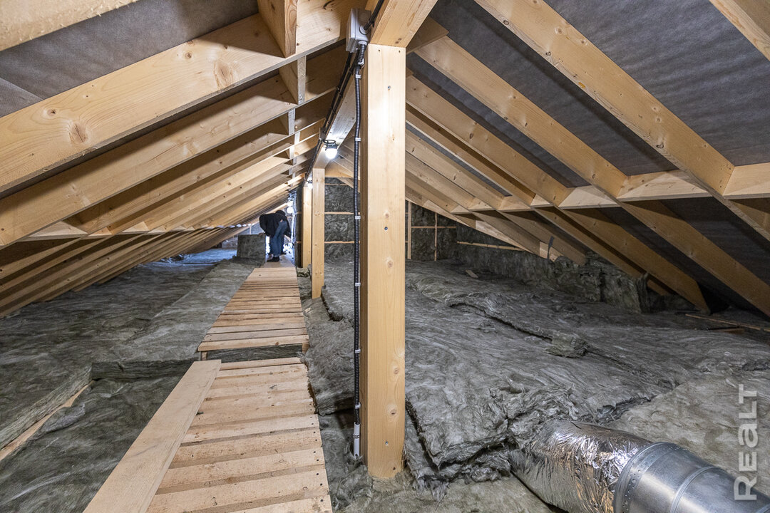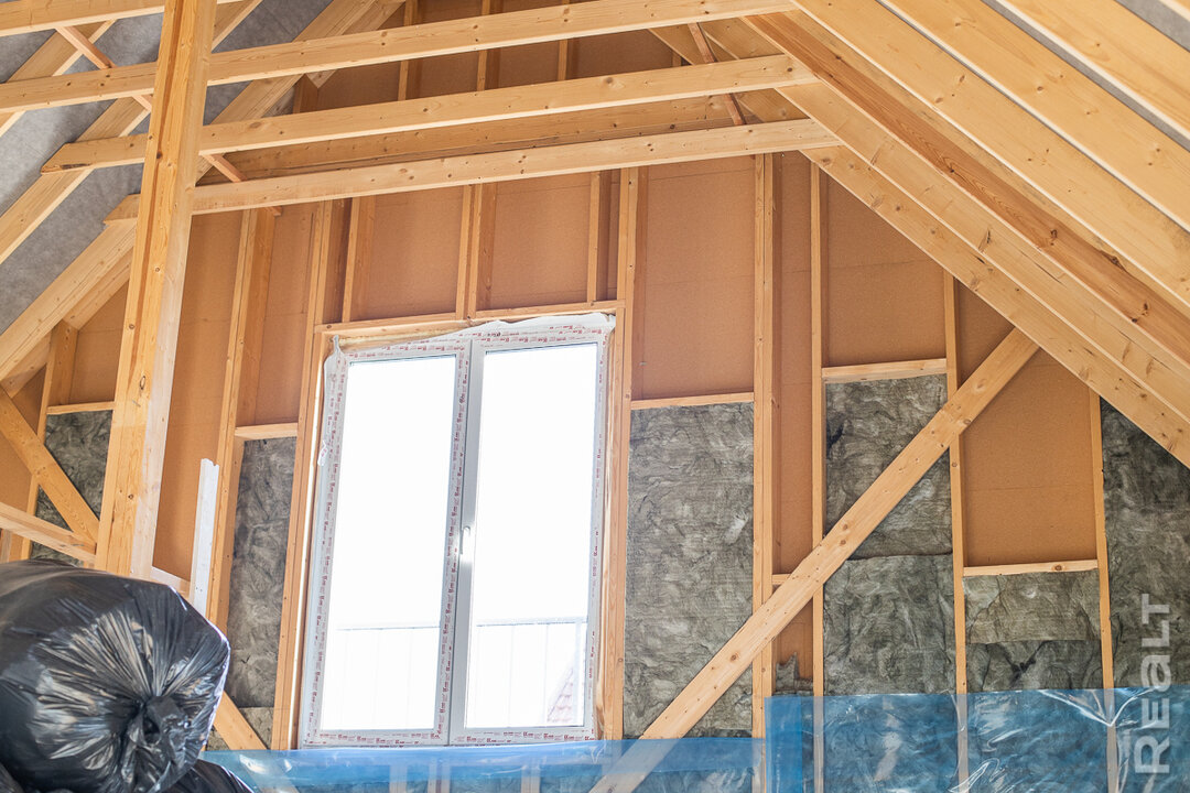 В стропильной части кровли или по перекрытию (если чердак холодный) также должно быть не менее 200 мм утеплителя. Чем больше — тем лучше. Деревянные конструкции (стропила, обрешетка) должны быть сухими, без синевы и грибка.