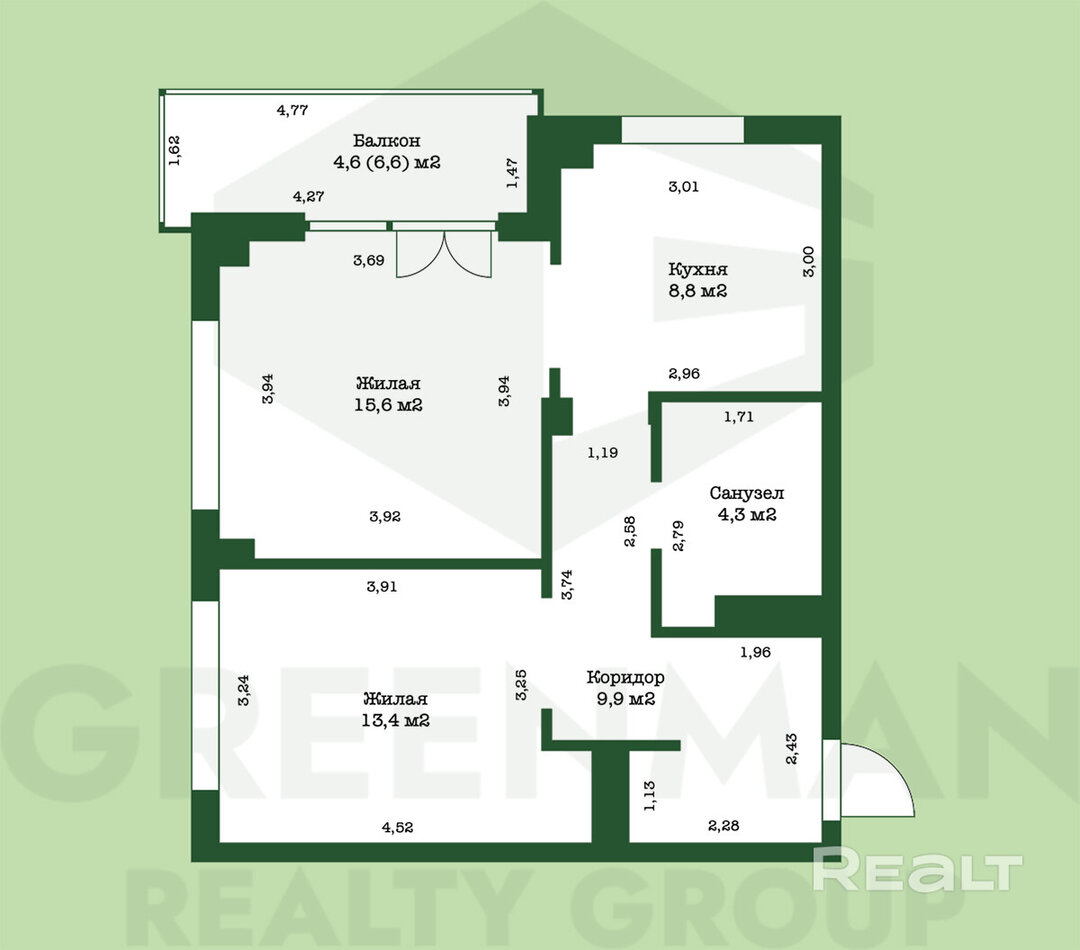 Дом на Ратомской, 50 является частью ЖК «Олимпик Парк». Его построили в девять этажей в 2019 году. На третьем этаже выставлена на продажу готовая двушка в 56,6 м². Кухня занимает 8,8 квадратного метра.