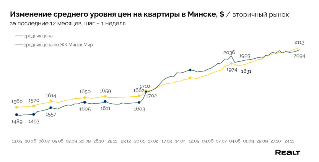 Если посчитать изменение цен по уже находившимся в продаже на прошлой неделе квартирам, то получим снижение цены в среднем на -2%. В то же время из-за новых объявлений, итоговый показатель за прошлую неделю показал прирост +0,5% до 2113 $\кв. м.