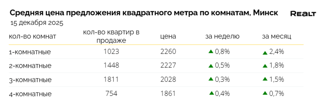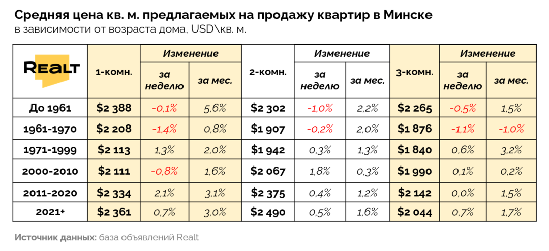 Брест — 1162 $/м2 (+0.5%), Витебск — 906 $/м2 (+0.2%), Гомель — 990 $/м2 (без изменений), Гродно — 1077 $/м2 (-0.1%), Могилев — 1023 $/м2 (+0.7%).