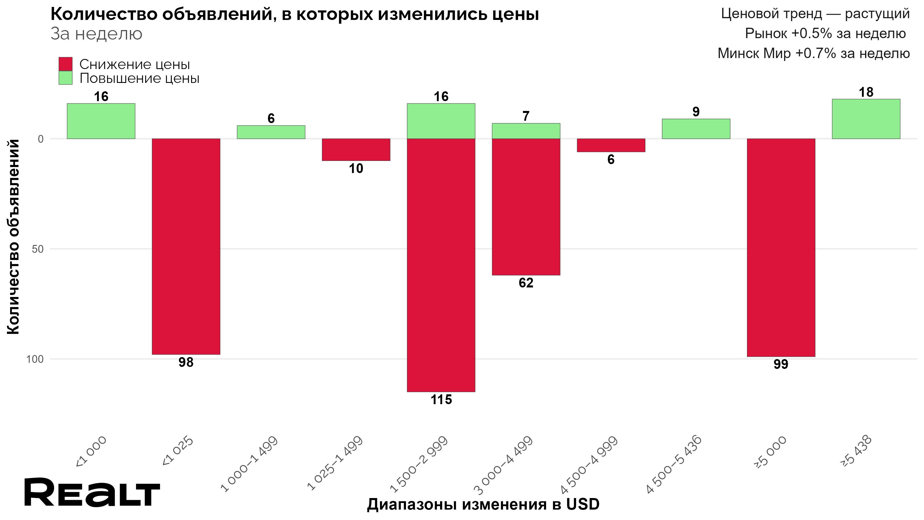 За прошлую неделю количество продавцов, снизивших цену в объявлении — снова немного, но увеличилось: подешевело 419 квартир в среднем на 1000−5000 долларов (около 8% от всего предложения). При этом количество случаев увеличения цены уменьшилось: стали дороже 104 квартиры (около 2%) в среднем на 1000−5000 долларов.