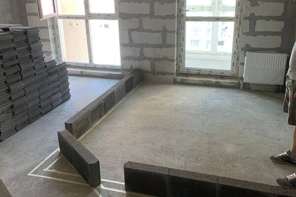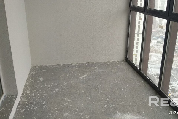 Квартира находится на 12-м этаже. Это стандартная студия общей площадью 32 квадрата. Здесь есть балкон и возведена стена. Стоит временный унитаз, говорит арендодатель. Вот как это все выглядит.