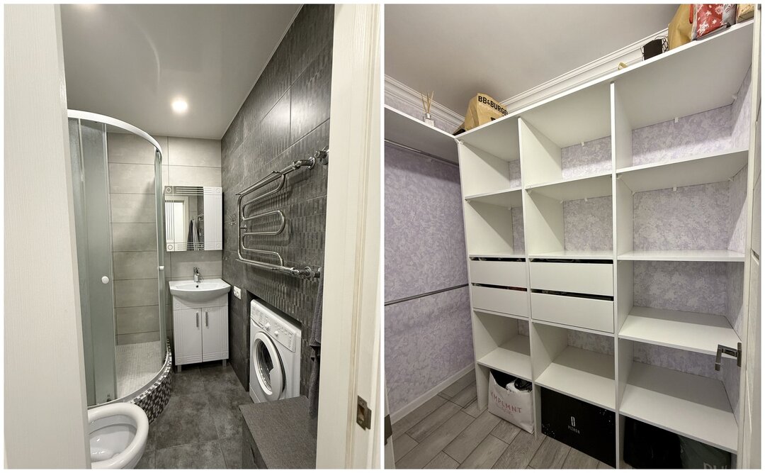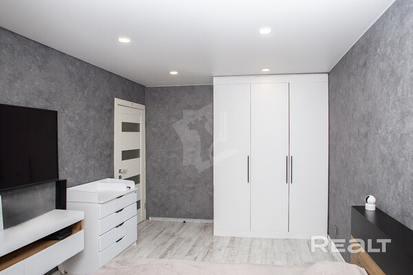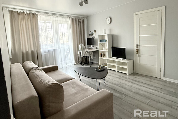 Квартира со светлым ремонтом. Тут была сделана небольшая перепланировка. Вместо коридора, который вел в кухню, владельцы сделали гардеробную. Получается, что две двери в гостиной ведут в кухню и спальню. Стены тут выровнены и окрашены, во всех комнатах на полу лежит ламинат, в санузле — плитка, сделаны натяжные потолки. В квартире есть застекленный балкон. Также закреплено место в подвале.