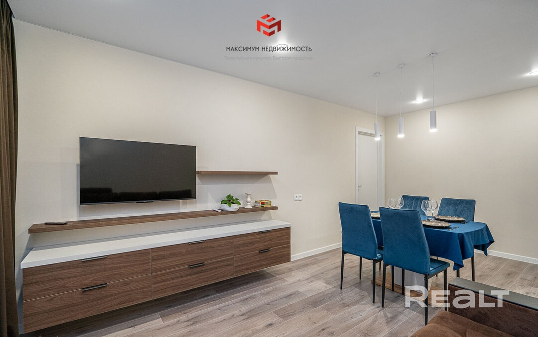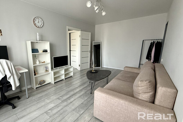 Квартира со свежим ремонтом, в котором еще никто не жил. Она обставлена техникой и мебелью. Одна из комнат — гостиная-столовая — проходная. Во второй — спальня.