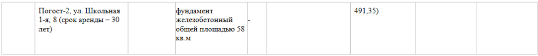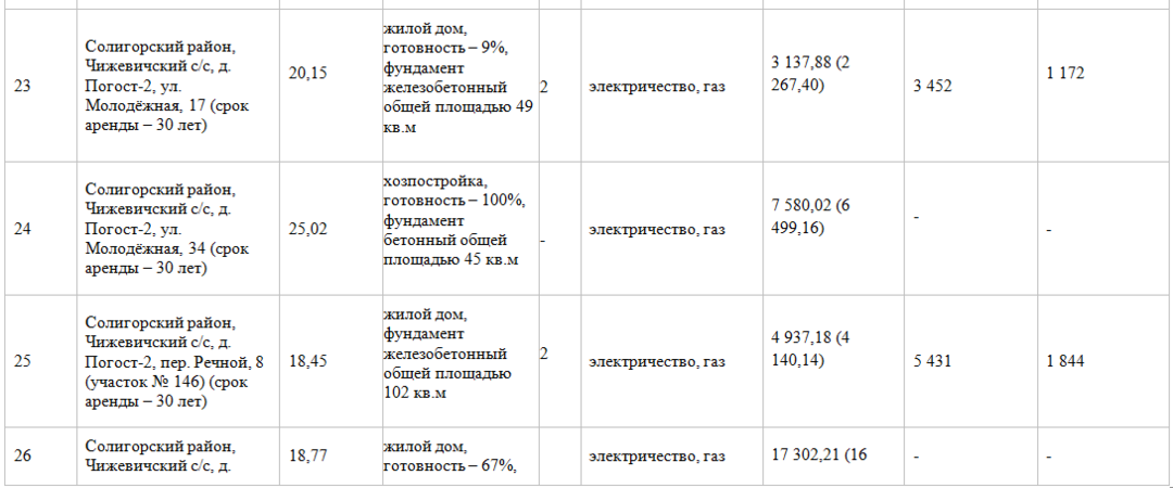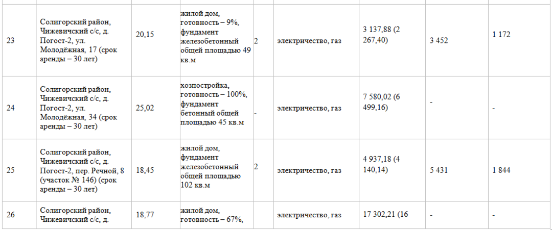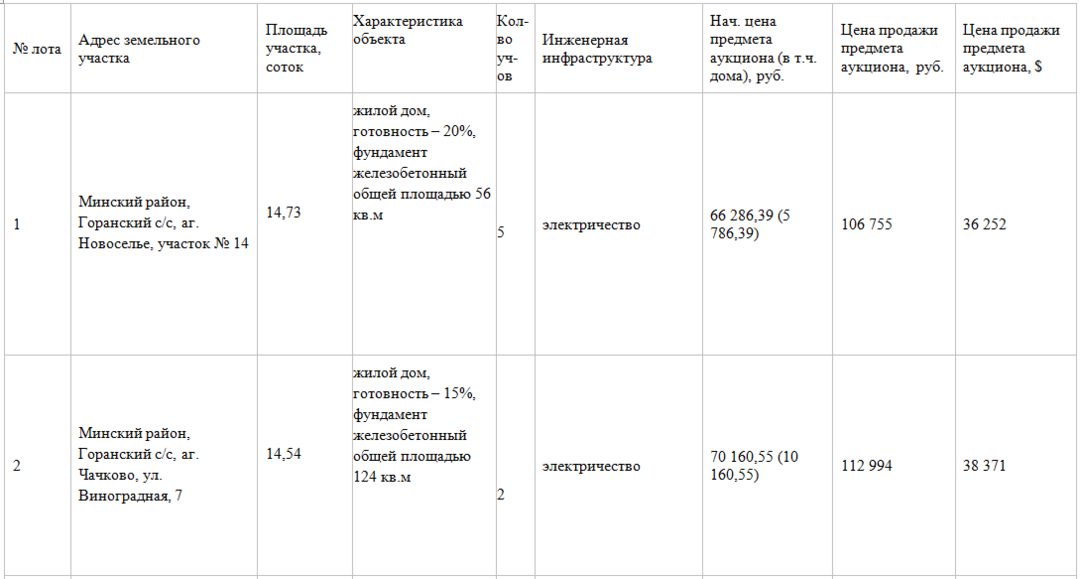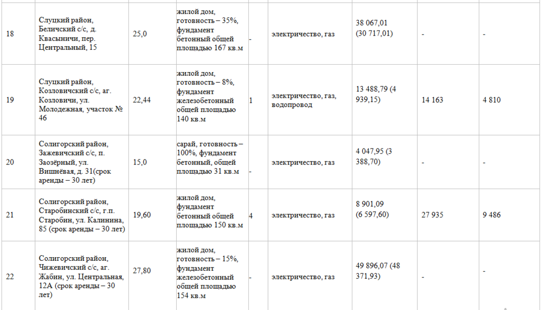 В Солигорском районе на аукцион в аренду на 30 лет предлагались 7 участков с недостроенными строениями. На один в городском поселке Старобин на улице Калинина, 85, Старобинского сельсовета подали 4 заявления. Бетонный фундамент насчитывает 150 квадратных метров. Из коммуникаций имеются электричество и газ. Стартовая цена на лот составила 8 901 рубль, в том числе дома — 6 598 рублей. Лот удалось продать за 27 935 рублей, или 9 486 долларов.