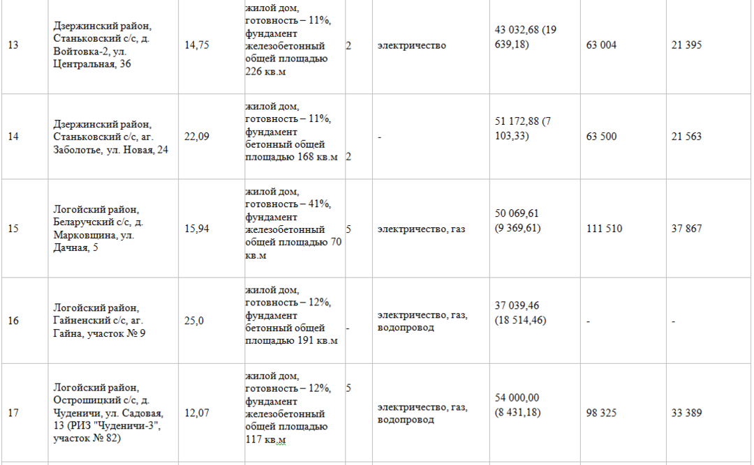 В Дзержинском районе на аукцион выставляли 4 участка с не завершенными строительством домами. Торги прошли по 2 лотам. Два заявления подали на лот № 13. Дом расположен в деревне Войтовка-2 на улице Центральной, 36, Станьковского сельсовета. Площадь участка насчитывает 14,7 сотки. Готовность строения составляет 11%. Общая площадь железобетонного фундамента насчитывает 226 квадратных метров. Имеется возможность подвести к дому электричество. Начальная цена на лот составила 43 033 рубля, в том числе дома — 19 639 рублей. Его продали за 63 004 рубля, или 21 395 долларов.
