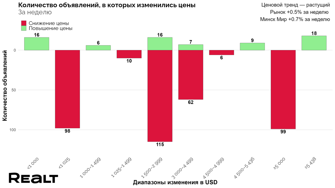 За неделю, из числа находившихся в продаже, подешевели 372 квартиры в среднем на 1000−4000 долларов (около 8% от всего предложения), но при этом количество случаев увеличения цены уменьшилось: стали дороже 97 квартир (около 2%) в среднем на 2000−6000 долларов.