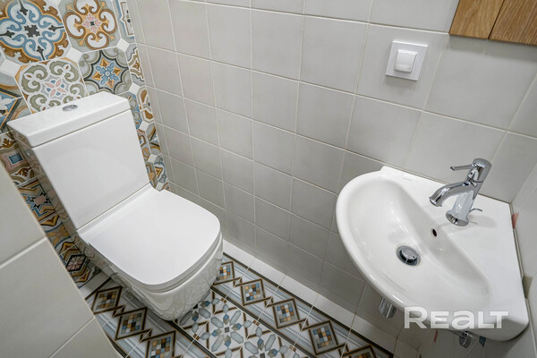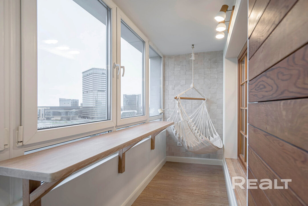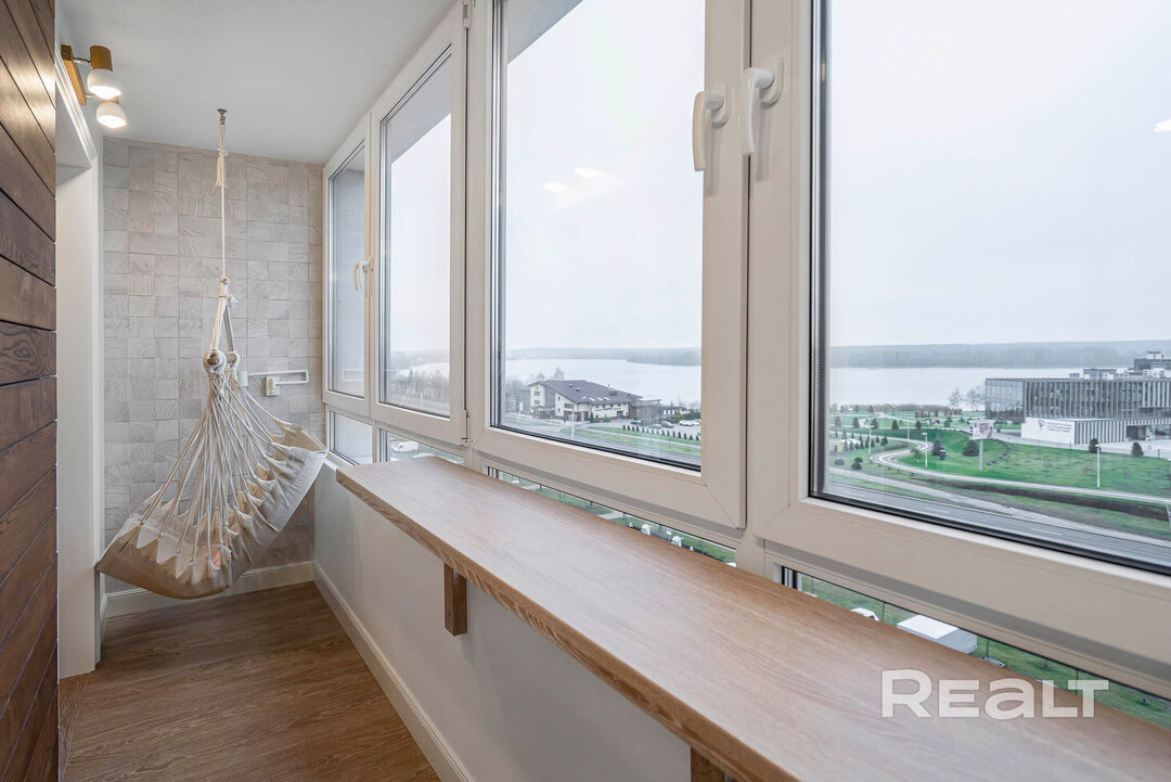 Ванная и туалет облицованы плиткой. Санузлы, кухня и лоджии идут с теплыми полами. Да, в квартире имеются две застекленные лоджии. Одна выходит на проспект и водохранилище, вторая, со спальни, смотрит во двор.