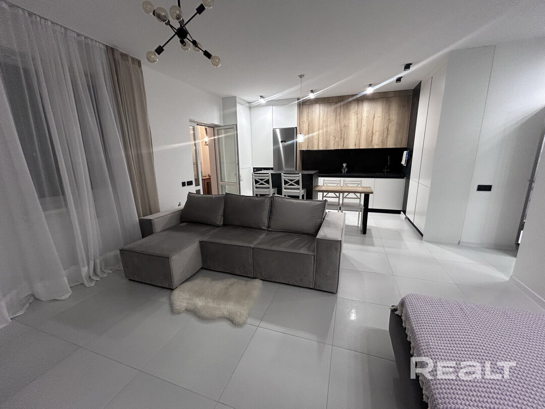 Есть в продаже аналогичная по метражу квартира, но с другой планировкой. Это жилье находится на девятом этаже. Площадь в 45 квадратов тут поделили между кухней-гостиной и отдельной спальней. В жилье — дизайнерский ремонт, качественная мебель, бытовая техника. Бонусом идет машино-место в крытом паркинге во дворе. Стоит такая квартира 160 тысяч долларов (3368 долларов — за метр).