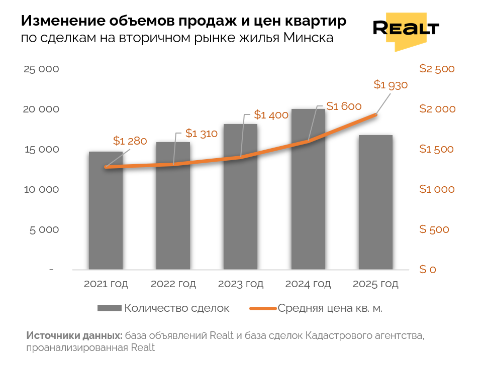 - Цены выросли: вторичка +21% (до ~$ 1 930 за кв. м по сделкам и ~$ 2 170 в объявлениях), новостройки +26% (до ~$ 1 950 за кв. м).