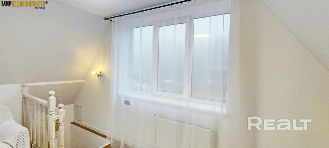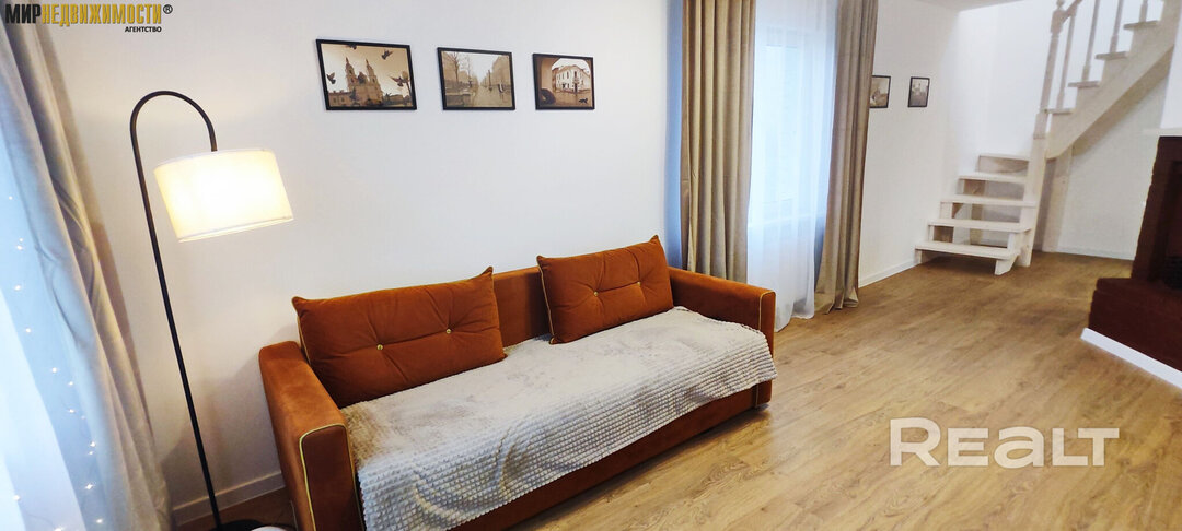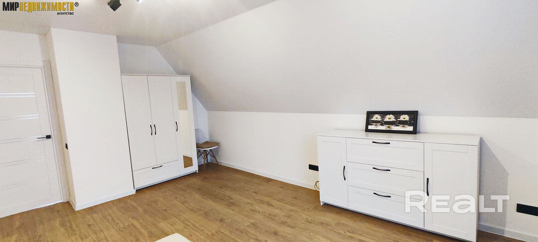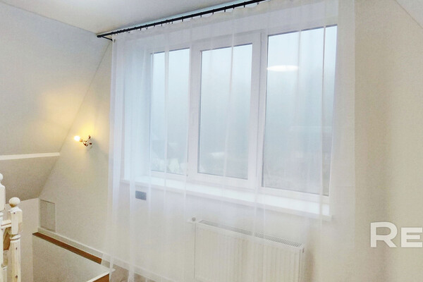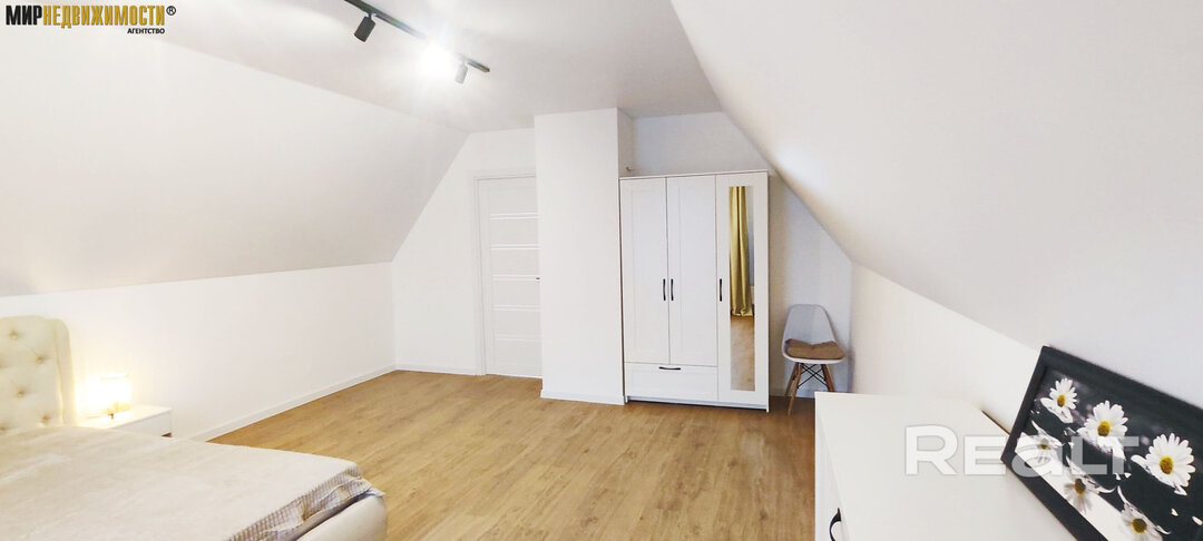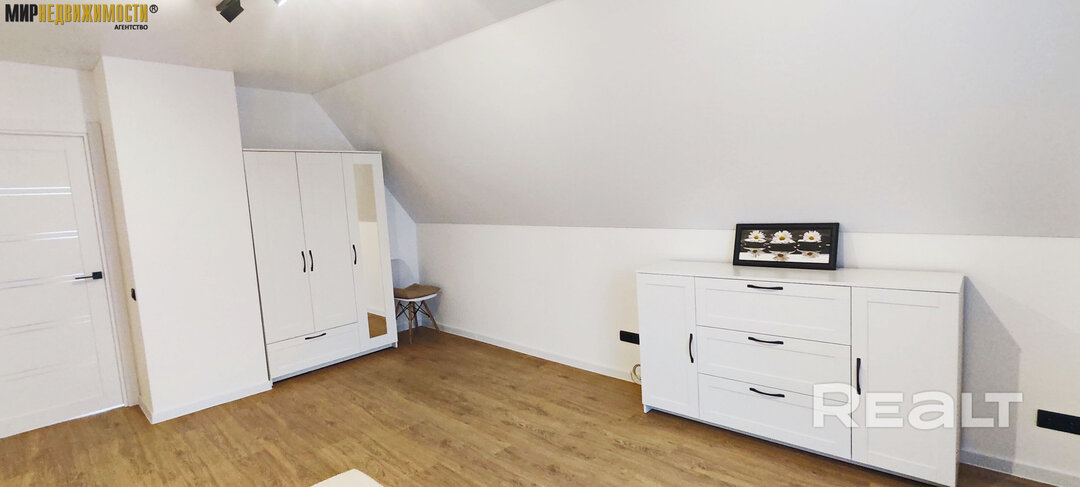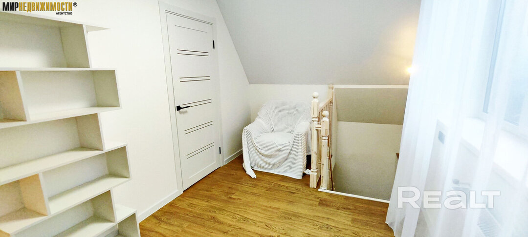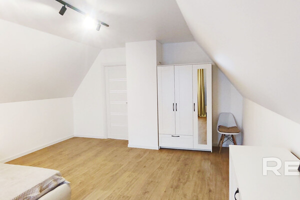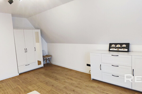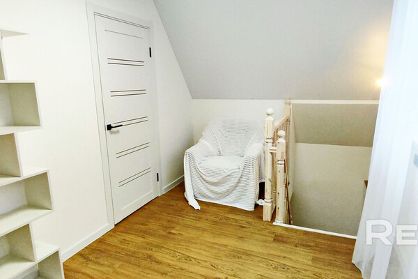 Наверху находится холл и просторная жилая комната, которая отделана в светлых тонах. Беспокоиться о наполнении мансарды мебелью не придется. Она уже полностью обставлена. Еще одна спальня организована на первом этаже.