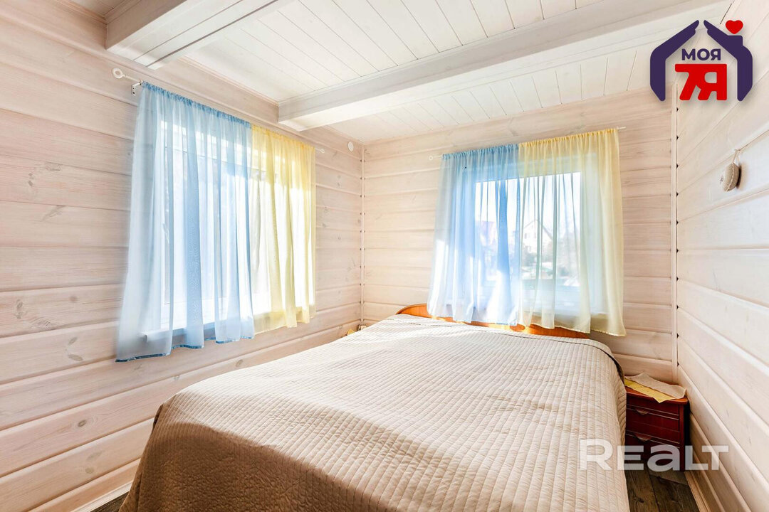 Симпатичный дом был построен в 1995 году, а в 2020-м тут был сделан капитальный ремонт. Бревенчатая дача стоит на высоком фундаменте, благодаря чему из комнат открывается хороший обзор. Окна — ПВХ, крыша — ондулин. Дополнительно заделаны фронтоны, что делает дом еще более теплым и энергоэффективным.