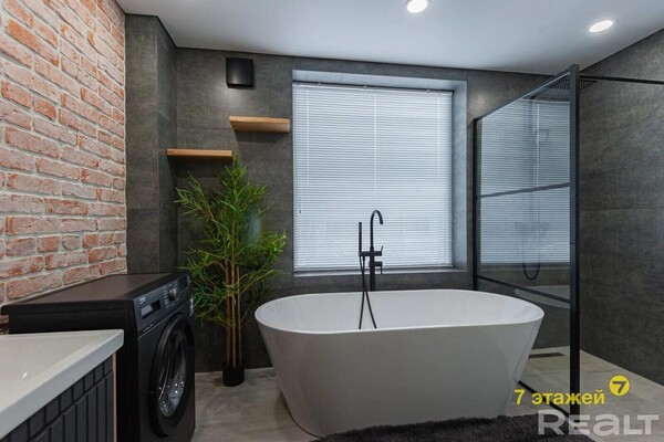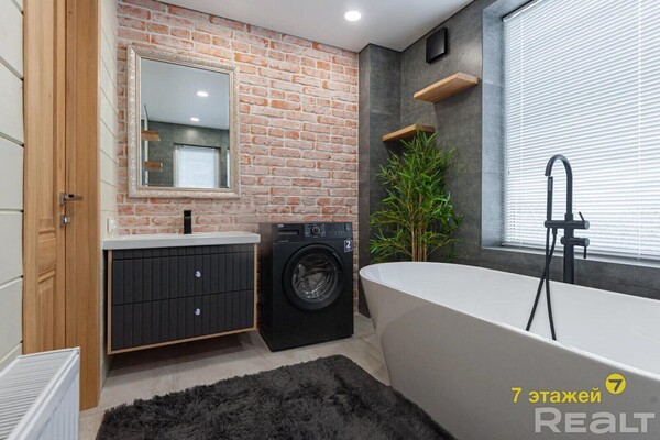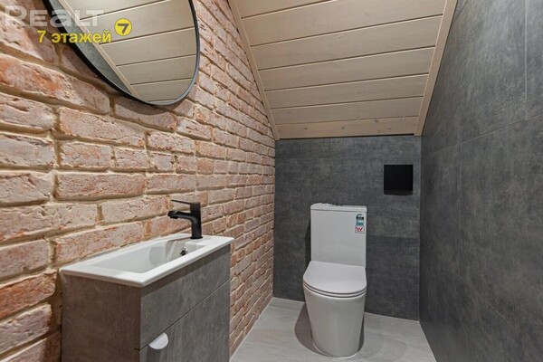 Санузлов в доме два — по одному на каждом уровне. На первом этаже он совмещенный, с ванной, душем и стиральной машиной. Отапливается дом на газу, вода поступает из скважины, а канализация — местная.