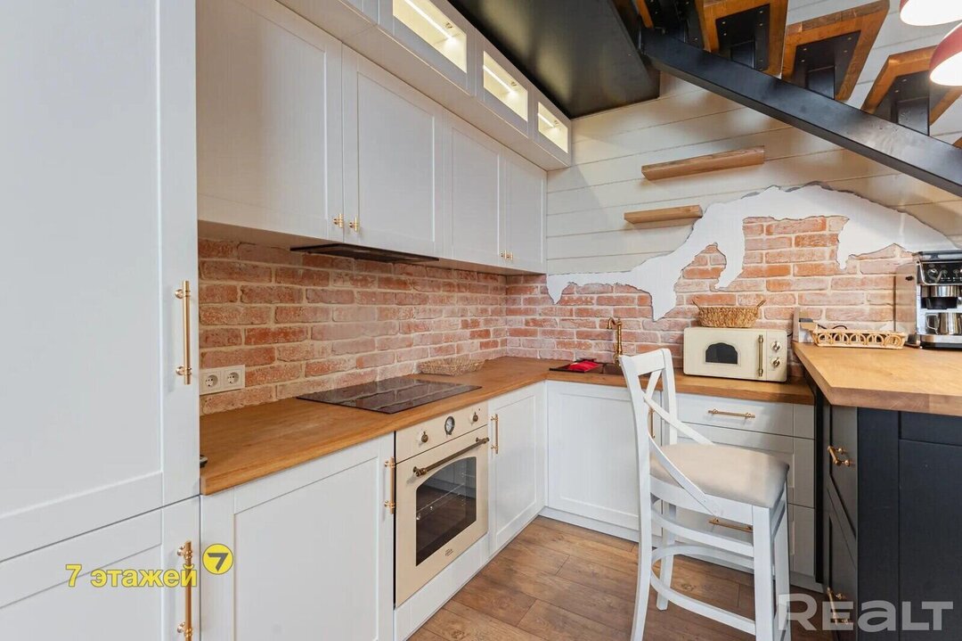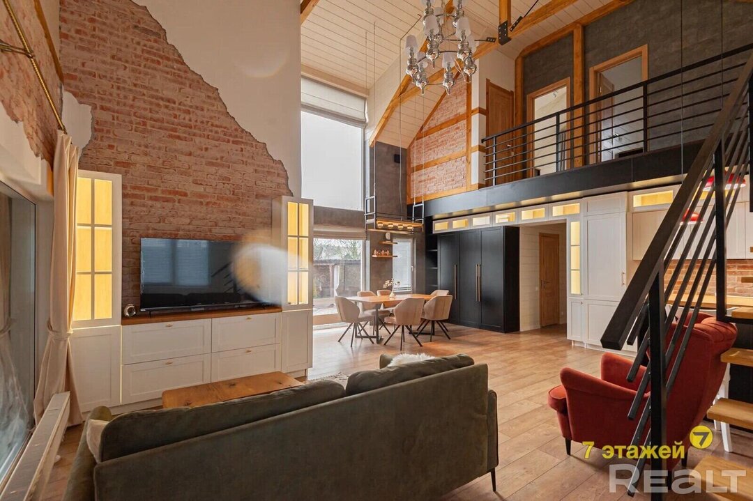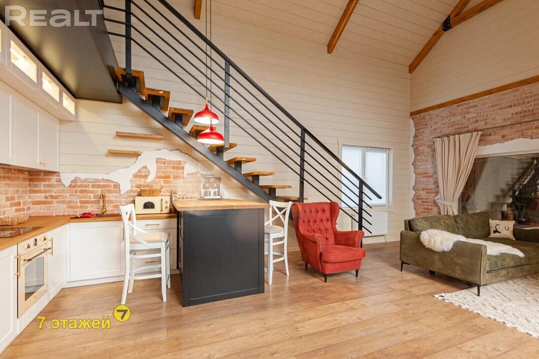 Самая большая комната — совмещенная кухня-гостиная. Объема ей придают большие окна и второй свет. В отделке гармонично сочетаются между собой кирпич, имитация бруса и декоративная штукатурка. Теплые оттенки разбавляет темная лестница и яркая мягкая мебель. Здесь все готово к проживанию, ведь после покупки в доме остаются мебель и техника.
