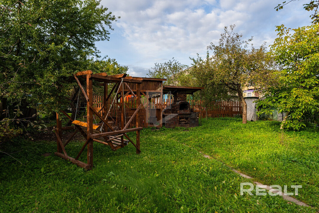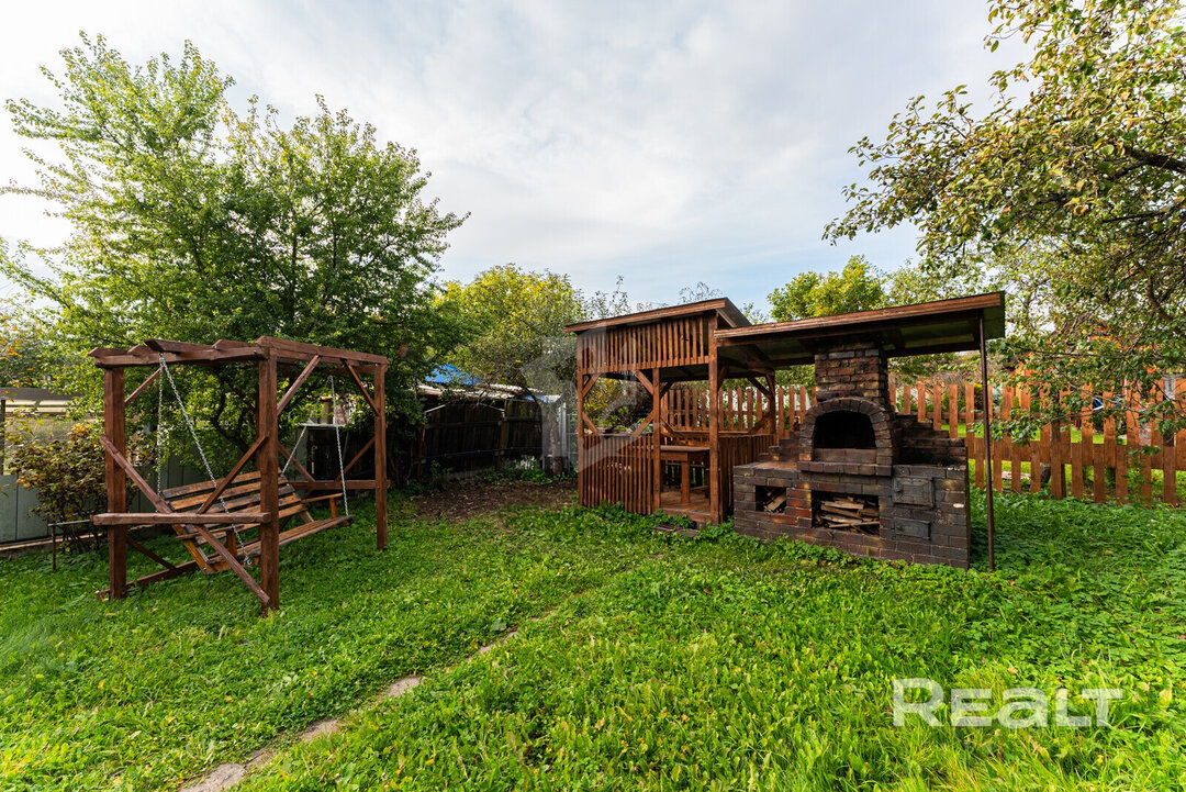 На участке в 5 соток также построены беседка, теплица, мангальная зона, стоят качели.