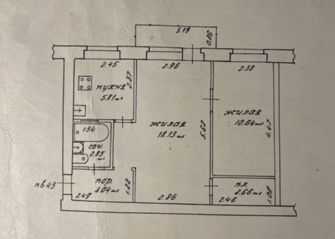 Пятиэтажный дом на Осипенко, 31 был построен в 1962 году. Здесь на четвертом этаже выставлена на продажу двушка в 43,1 м². На кухню приходится 5,81 м².