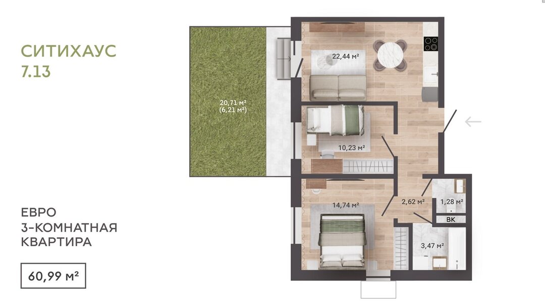 В трех подъездах переменной этажности (6, 7 и 8 этажей) разместятся 104 квартиры: от компактных евродвушек до просторных пятикомнатных. Внутри предусмотрены большие спальни, гардеробные или кабинеты. Все балконы в квартирах будут открытыми.