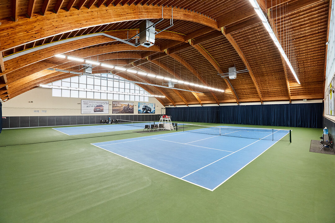 В зале расположены 2 крытых теннисных корта с естественным освещением за счет больших оконных зон, матированных для защиты от прямых солнечных лучей. Сделаны 4 линии бестеневой профессиональной подсветки для спортивных залов высокого уровня.