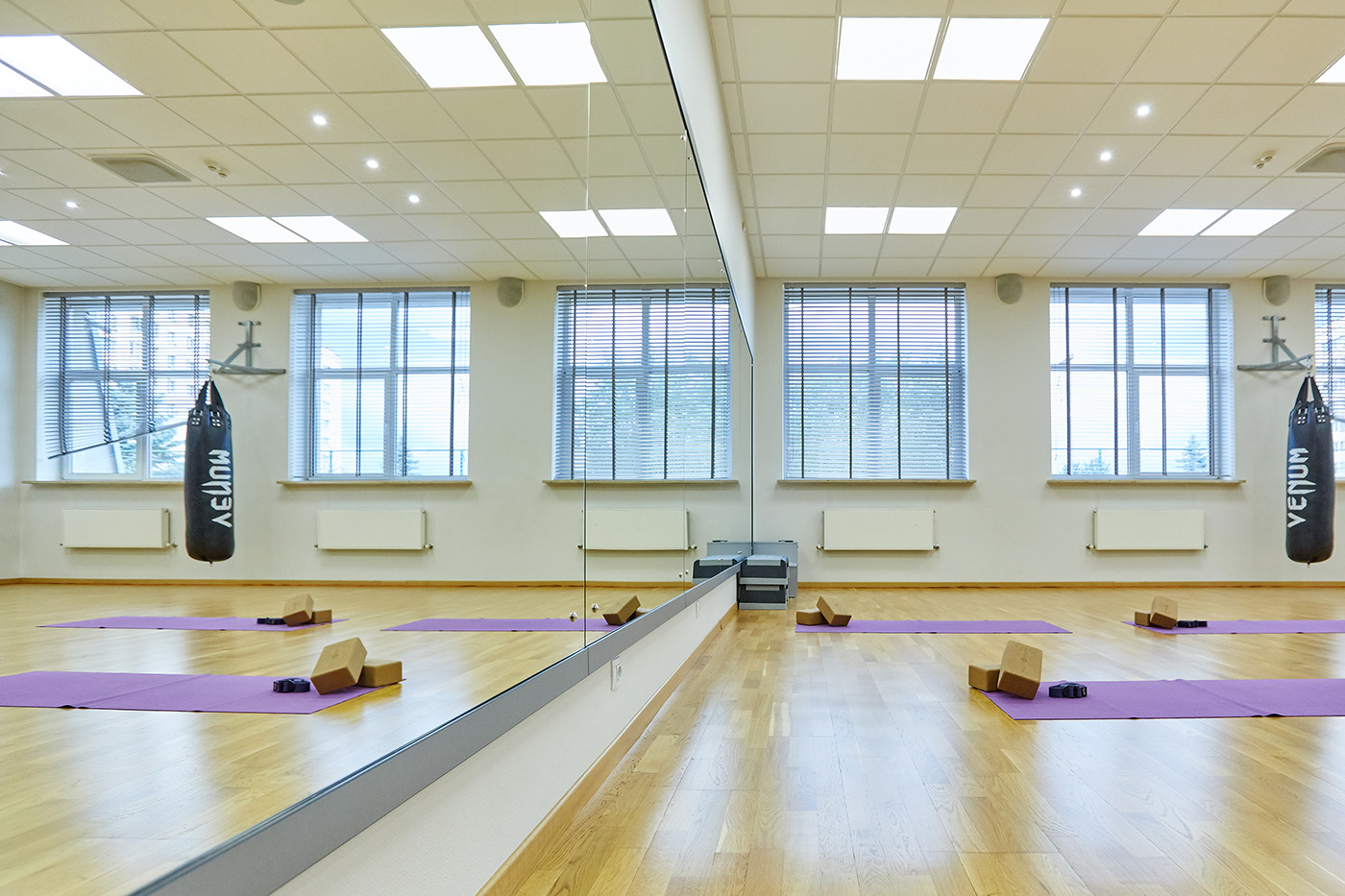 - просторный зал для разминки, занятий йогой, пилатесом и другими направлениями фитнеса;