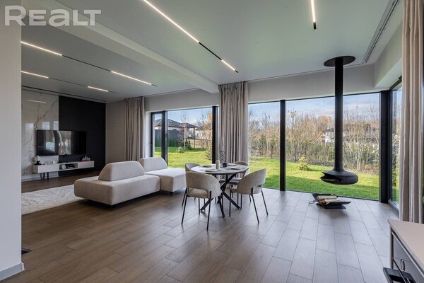 Современный вид имеет и интерьер: светлую отделку и мебель разбавляют теплый цвет пола и природа, за которой можно наблюдать через панорамные окна. Вместе с подвесным камином они наполняют гостиную особенным уютом.