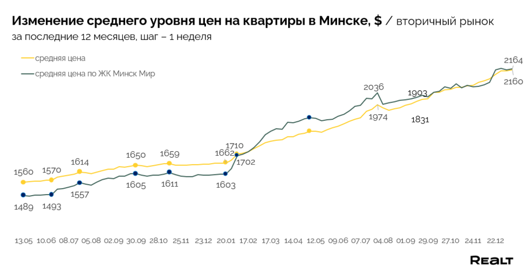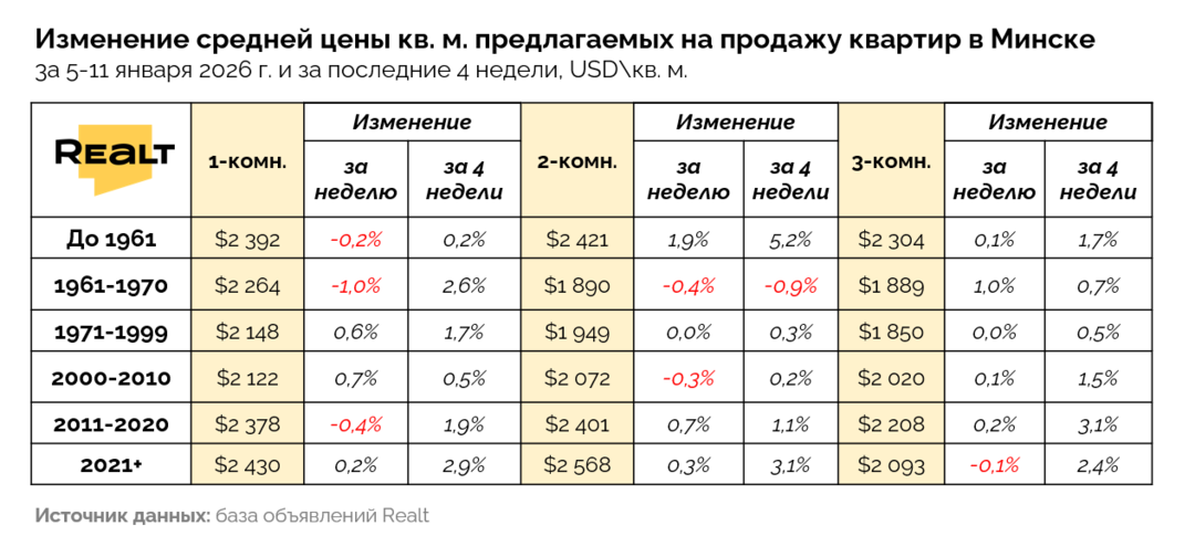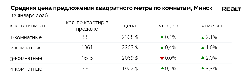 Брест — 1169 $/м2 (+0.1%), Витебск — 928 $/м2 (+0.5%), Гомель — 999 $/м2 (+0.4%), Гродно — 1090 $/м2 (+0.3%), Могилев — 1025 $/м2 (-0.8%).