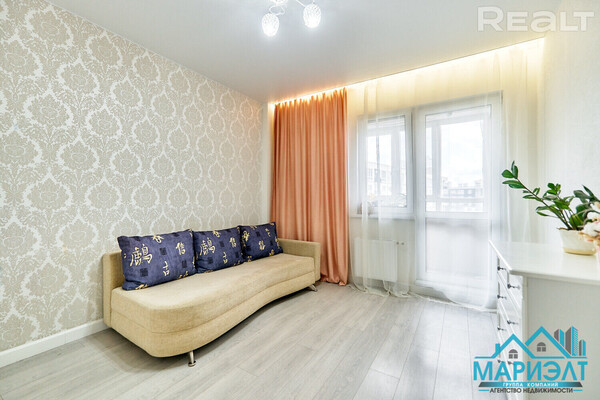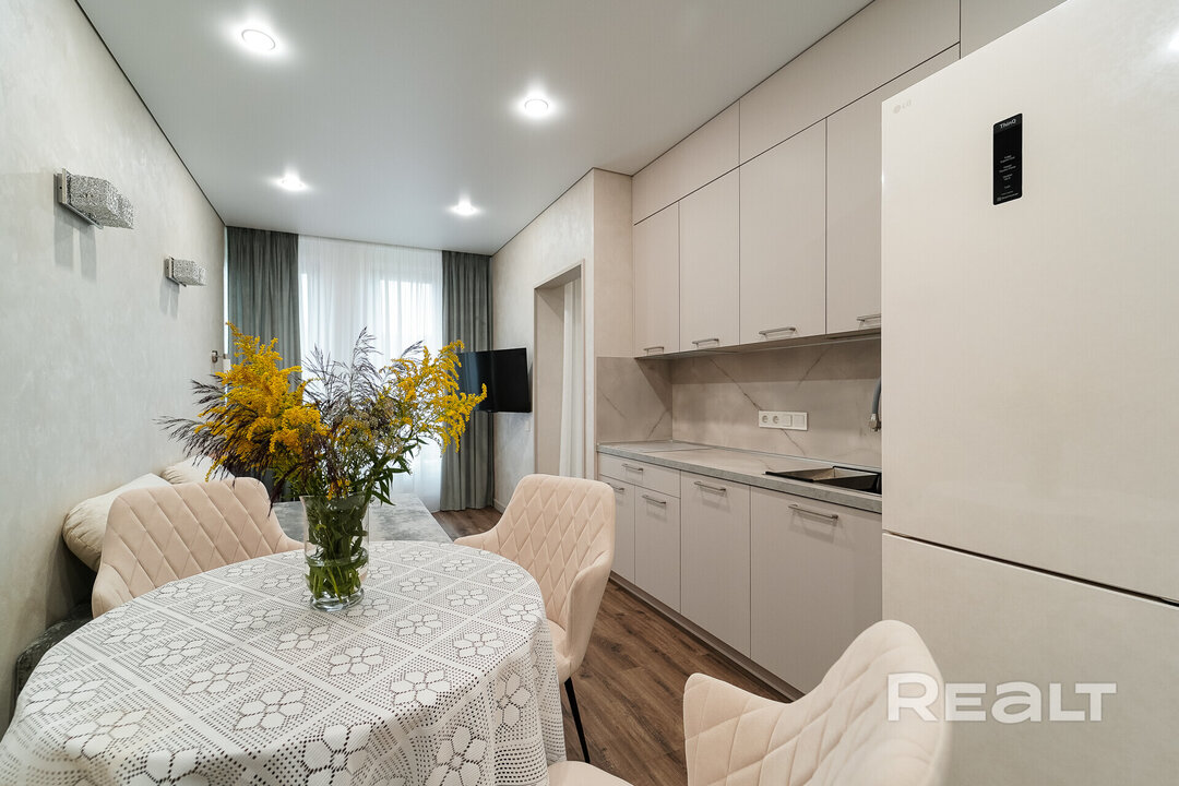 На полу в квартире уложен ламинат, стены оклеены однотонными обоями, потолок матовый натяжной с точечными светильниками и парящими линиями. В кухне из техники есть индукционная варочная поверхность, духовой шкаф, вытяжка, посудомоечная машина и холодильник. В гостиной зоне — обеденная группа, диван со спальным местом и телевизор. Здесь же есть выход на лоджию.