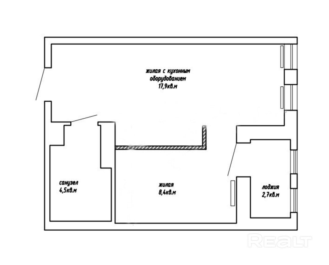Общая площадь — 33 квадрата. На стенах декоративная штукатурка, на полу кварц-винил, в санузле пол с подогревом. Установлен кондиционер. Вся техника на расширенной пятилетней гарантии. В жилой комнате сделан ремонт, но мебели нет. Есть застекленная лоджия. Санузел совмещенный. Есть кладовая на цокольном этаже.