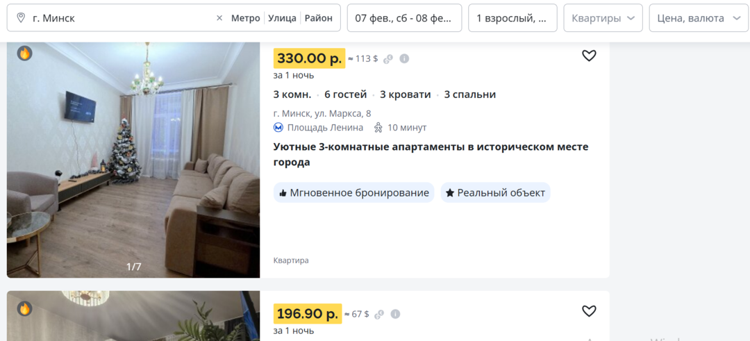 Мы просто вписали в сервисе Realt.Бронь желаемые даты (7−8 февраля) для заселения в Минске — и получили множество вариантов квартир на выбор. Конкретно эта квартира привлекла нас локацией и близостью ко всем достопримечательностям. Рядом — метро «Площадь Победы», парк Горького (со снегом он просто прекрасен!), множество кафе и ресторанов.