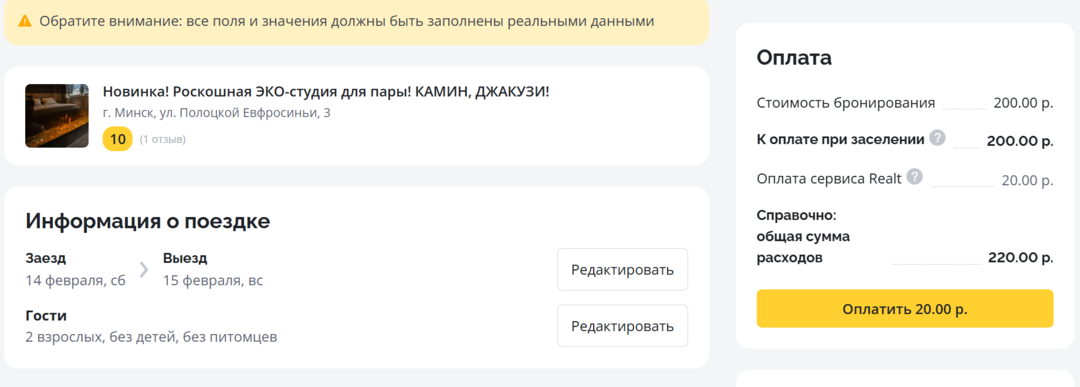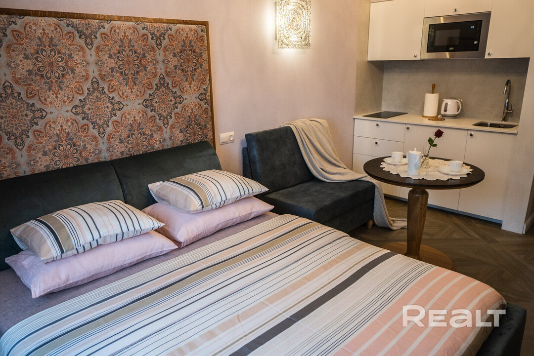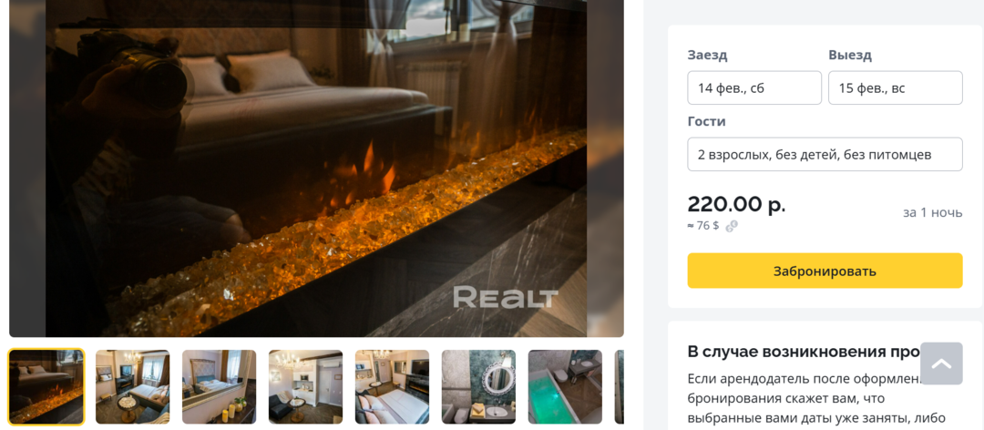 Мы просто вписали в сервисе Realt.Бронь желаемые даты (14−15 февраля) для заселения в Минске — и получили множество вариантов квартир на выбор. Конкретно эта квартира привлекла нас интересным наполнением и близостью к метро. К тому же, прямо в этом доме находится сразу несколько кофеен, куда можно сходить на завтрак. Сутки в такой квартире на выбранную нами дату стоят 76 долларов.