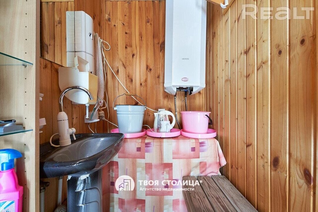 Из коммуникаций — сезонная вода (установлен электрический бойлер), местная канализация из 4 бетонных колец. Отметим, что санузел и душевая расположены в отдельном хозяйственном блоке, но выглядят вполне достойно. Отопление на — даче печное. В дом подведено электричество на 380 В.