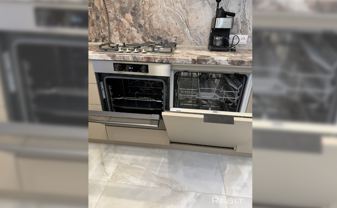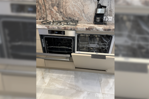 Площадь кухни — 9 квадратов. Из техники есть посудомоечная машина, духовой шкаф, газовая плита, встроенная СВЧ-печь.