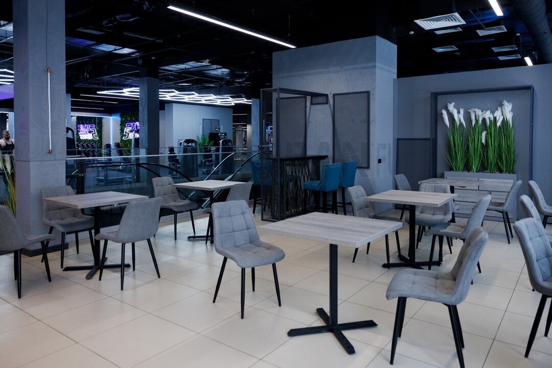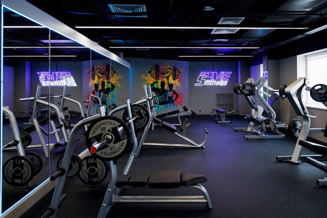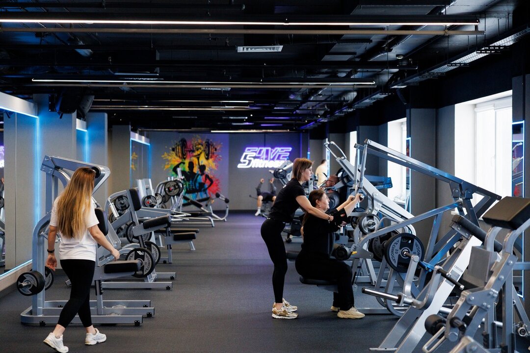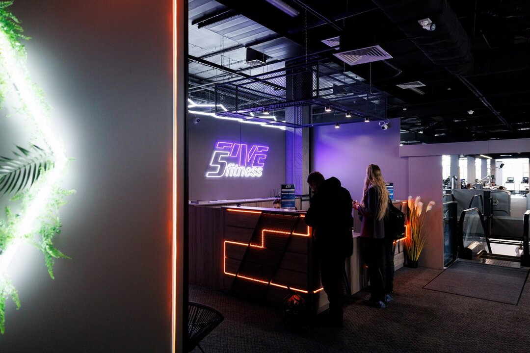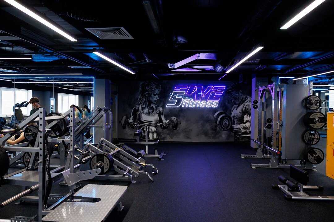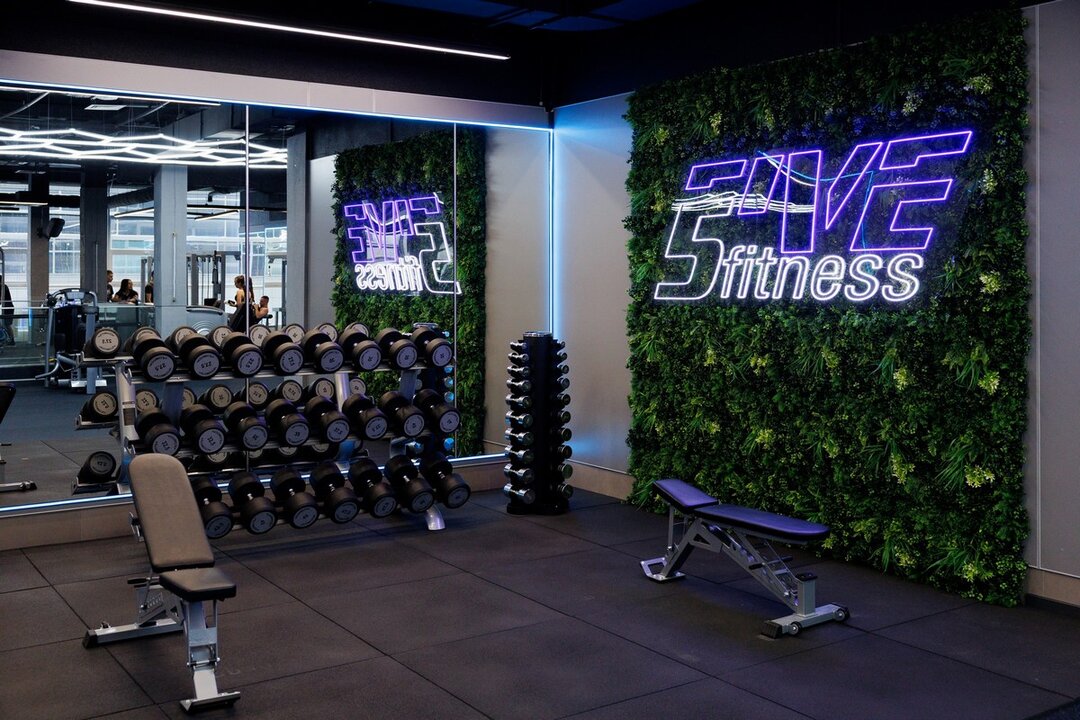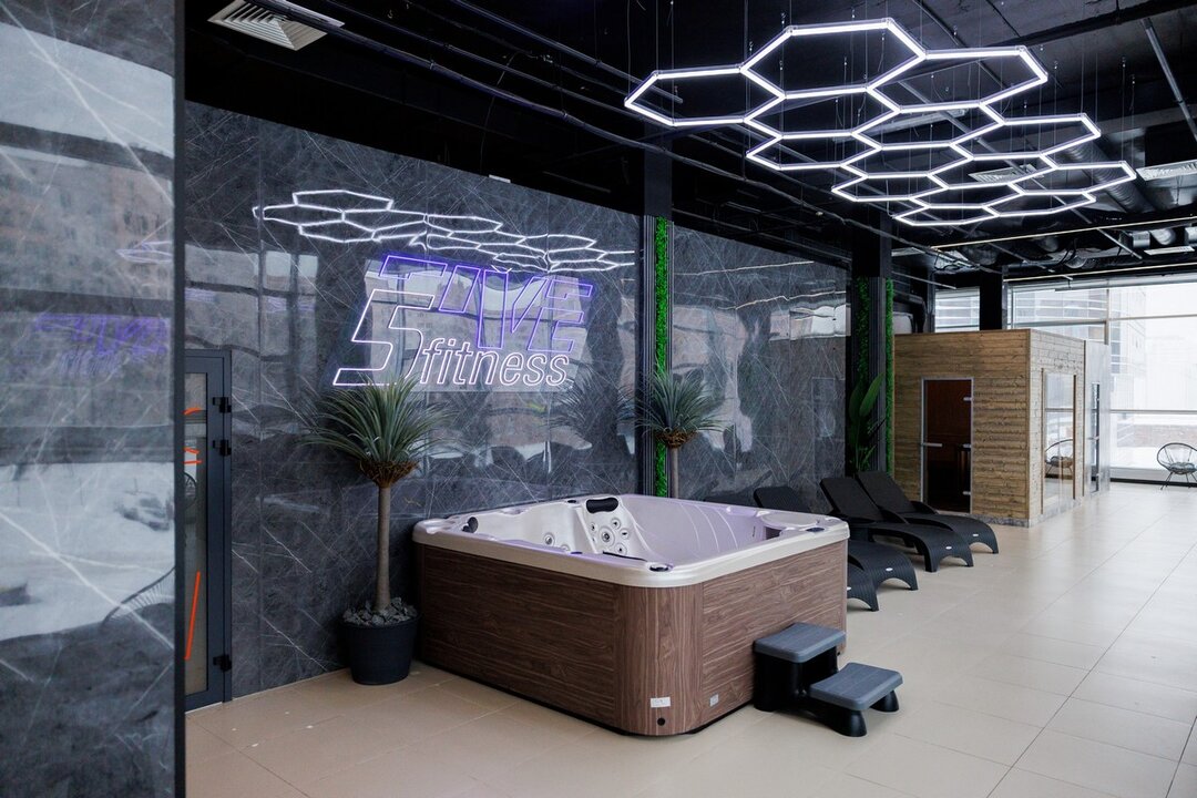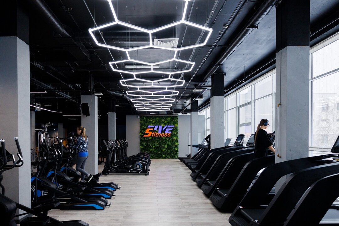 5Five Fitness занимает более 2400 «квадратов». В просторный фитнес-центр ведут лестницы и свой эскалатор. Интерьер выполнен в современном стиле — с арт-стенами, стильной навигацией над головой, неоновой подсветкой и селфи-зеркалами во весь рост. Интересная деталь: в центре клуба стоят умывальники с бесплатной питьевой водой.