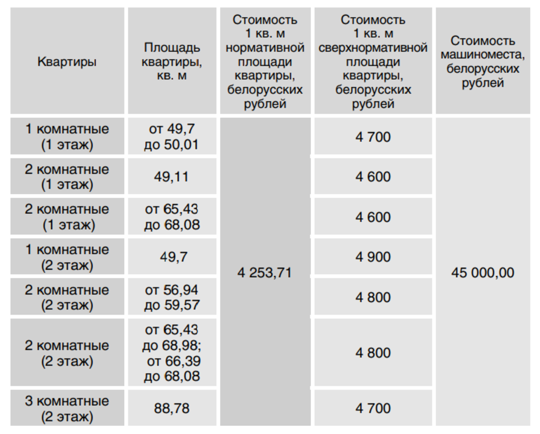 Стоимость квадрата для граждан, состоящих на учете нуждающихся в улучшении жилищных условий, составляет 4253 рубля (около 1460 долларов). Это касается нормированной площади — 15 квадратных метров на человека (при строительстве для одного человека однокомнатной квартиры − 30 квадратов). Метры сверх нормы нужно оплачивать по другим ценам — от 4600 до 4900 рублей (1580−1685 долларов), в зависимости от метража квартиры.