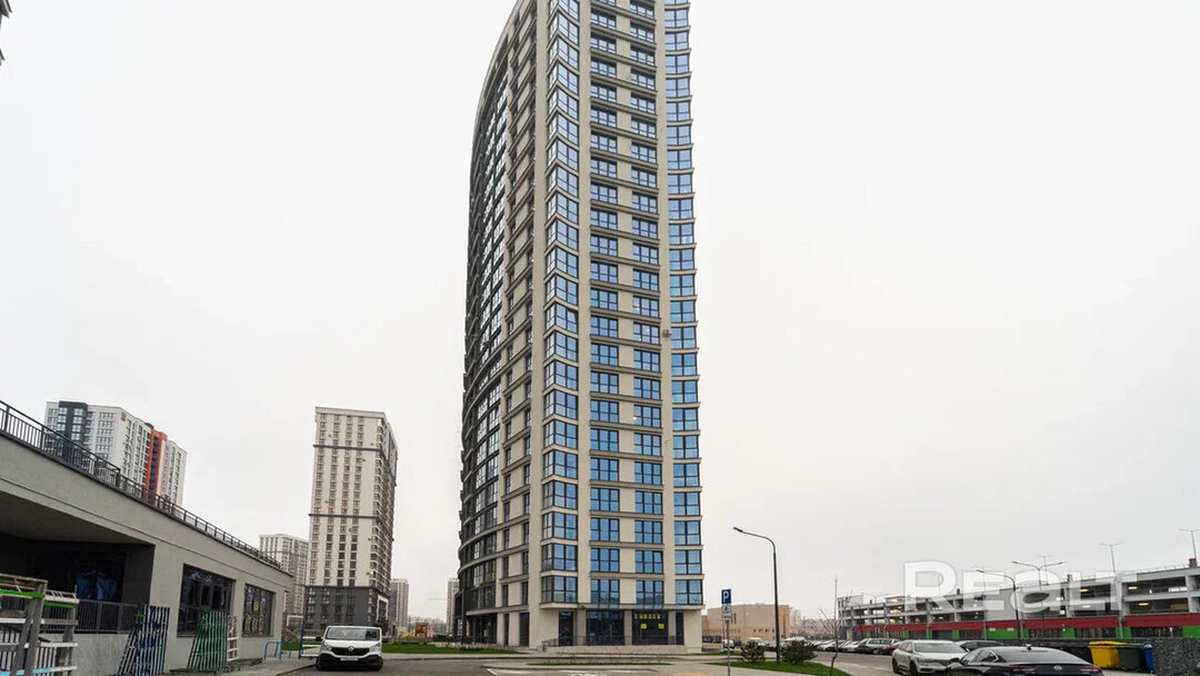 Первая квартира в подборке расположена на последнем уровне 25-этажного дома на Рафиева, 54, построенного в 2013 году. Площадь студии — 39,7м².