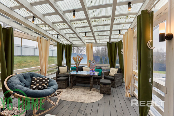 Есть около входной группы небольшая застекленная веранда. Также к дому пристроена терраса. Туда провели электричество, поставили мягкую мебель. В общем, имеется все, чтобы наблюдать за красивым участком.