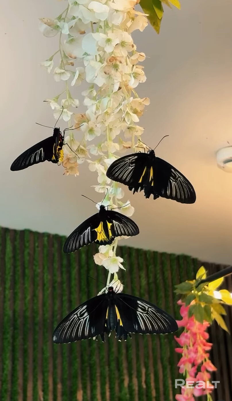 В объявлении отмечается, что в помещении организовано круглогодичное проведение выставок живых экзотических бабочек необычных расцветок и размеров со всех уголков мира. Посетители могут наблюдать наиболее интересные моменты жизненного цикла бабочек: рождение из куколки, кормление, а также делать незабываемые фото/видео. Кстати, еженедельно видовой состав выставки меняется на 25−40%.
