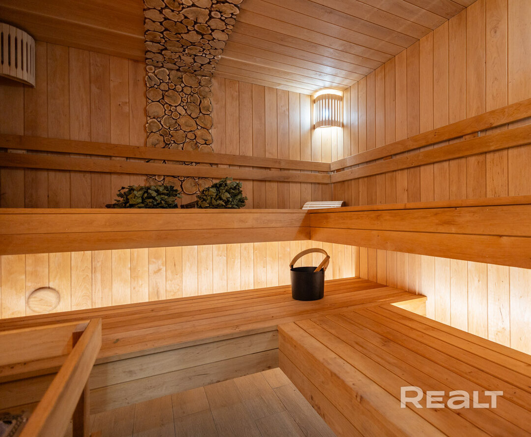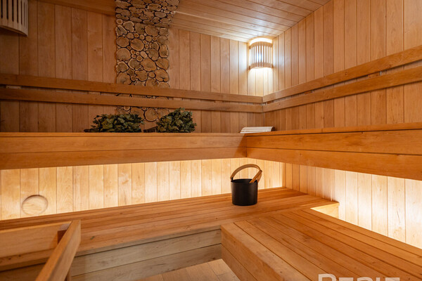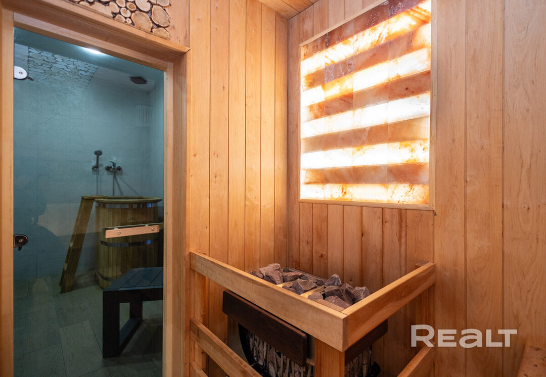 Сауна с отделкой из можжевельника и гималайской соли является частью дома, готова к использованию в любой момент.