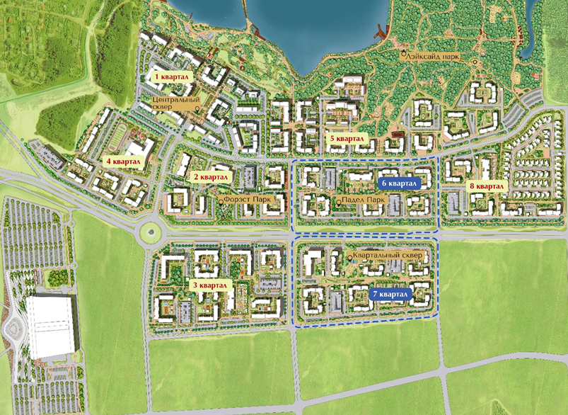 Общая площадь 6-го квартала составит 10 га. Здесь запланировано строительство 9 домов среднеэтажной застройки высотой 6−10 этажей, а суммарная площадь квартир превысит 84 000 м². Архитектура домов 6-го квартала будет выполнена в единой стилистике, гармонично вписывающейся в общий облик жилого комплекса.