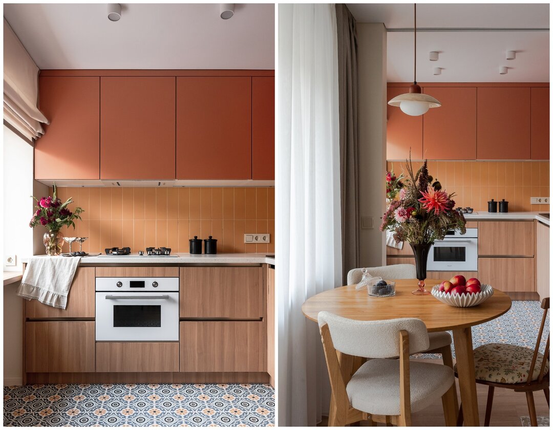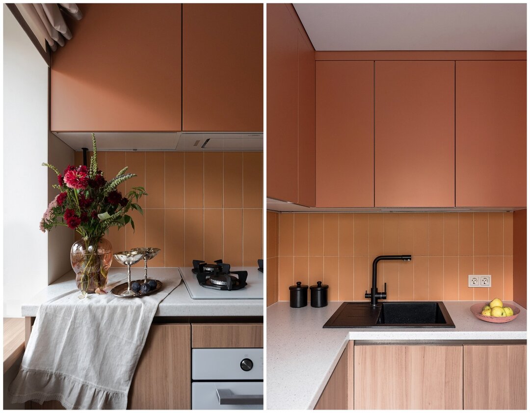 — Верхние шкафы и блок с холодильником выполнены из крашеного МДФ, чтобы попасть в нужный оттенок делали выкрасы. Нижние фасады — из ЛДСП с теплой текстурой дерева, столешница изготовлена из постформинга. Такое сочетание позволило добиться баланса между эстетикой и практичностью, а также немного сэкономить бюджет: кухня выглядит лаконично и современно, но при этом не требует сложного ухода. В поддержку к фасадам подобрали керамическую плитку испанского производителя.
