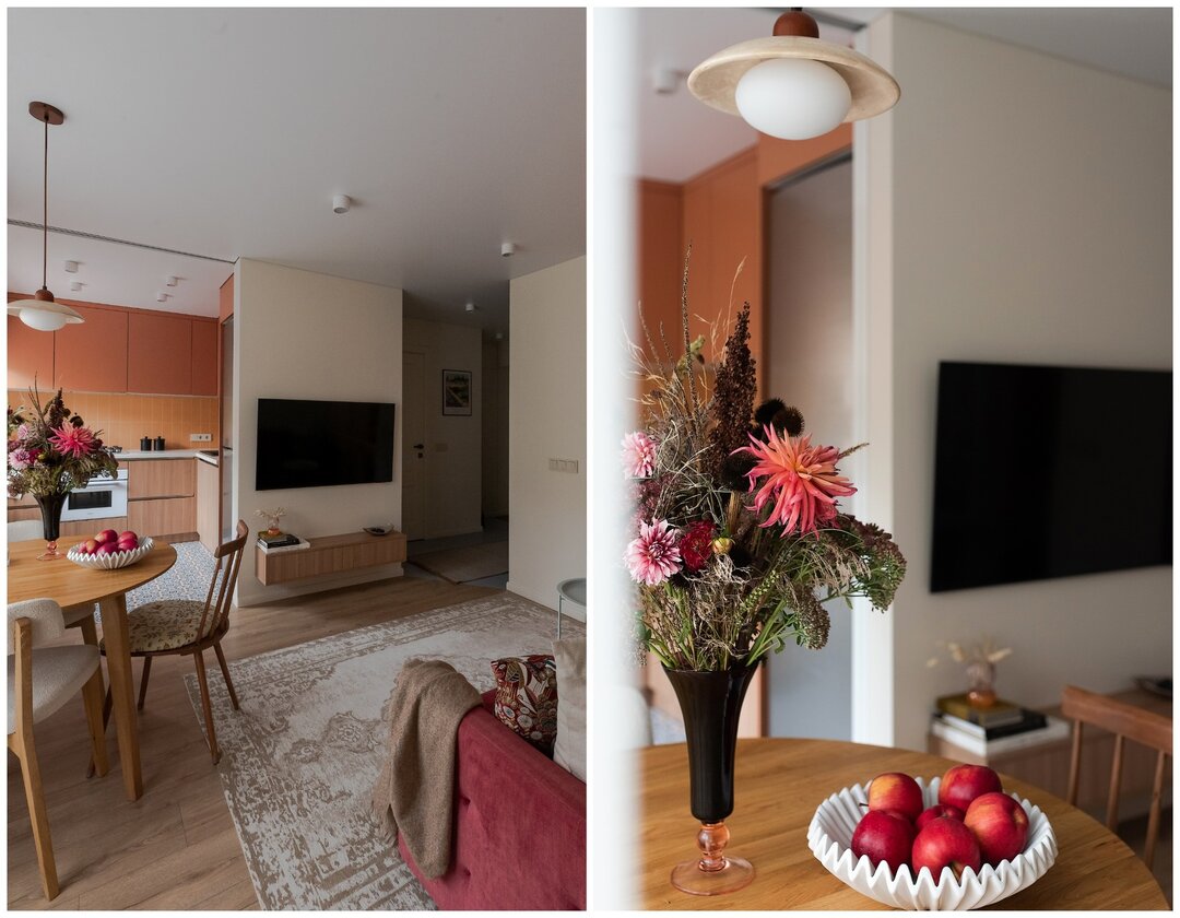 Одна из главных идей, вокруг которой строился проект — любовь хозяйки квартиры к определнной картине, где изображен рассвет. Расположение кухни такое, что утром сюда попадает красивый утренний свет. Эту атмосферу решено было продлить, создав в кухне визуальный закат. Так она стала центром притяжения всей квартиры.