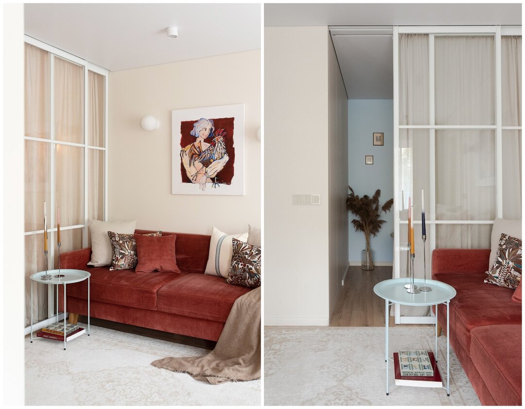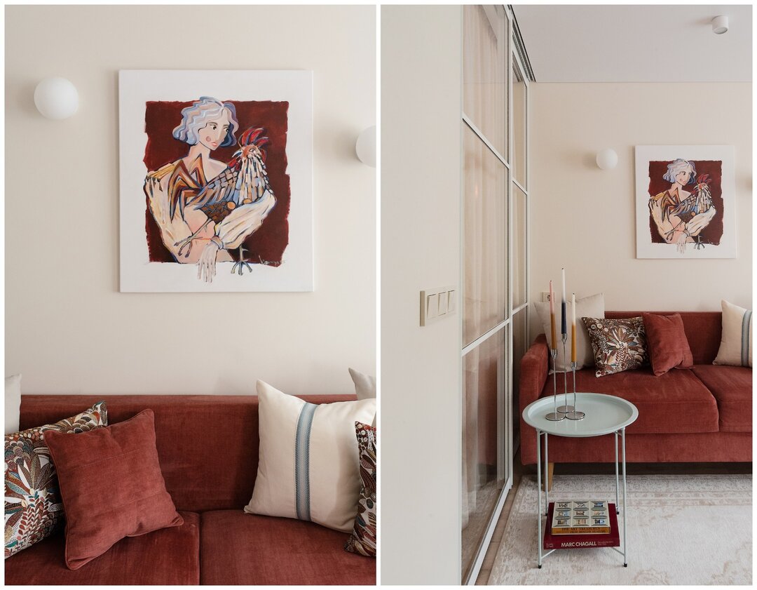 В части гостиной, как и просили собственники, поставили диван, на противоположной стене висит телевизор. Пространство над диваном также украшает работа художницы Екатерины Осиповой с изображением петуха. Он стал эмоциональным акцентом пространства и буквально собрал вокруг себя весь декор — от подушек до мелких цветовых деталей.