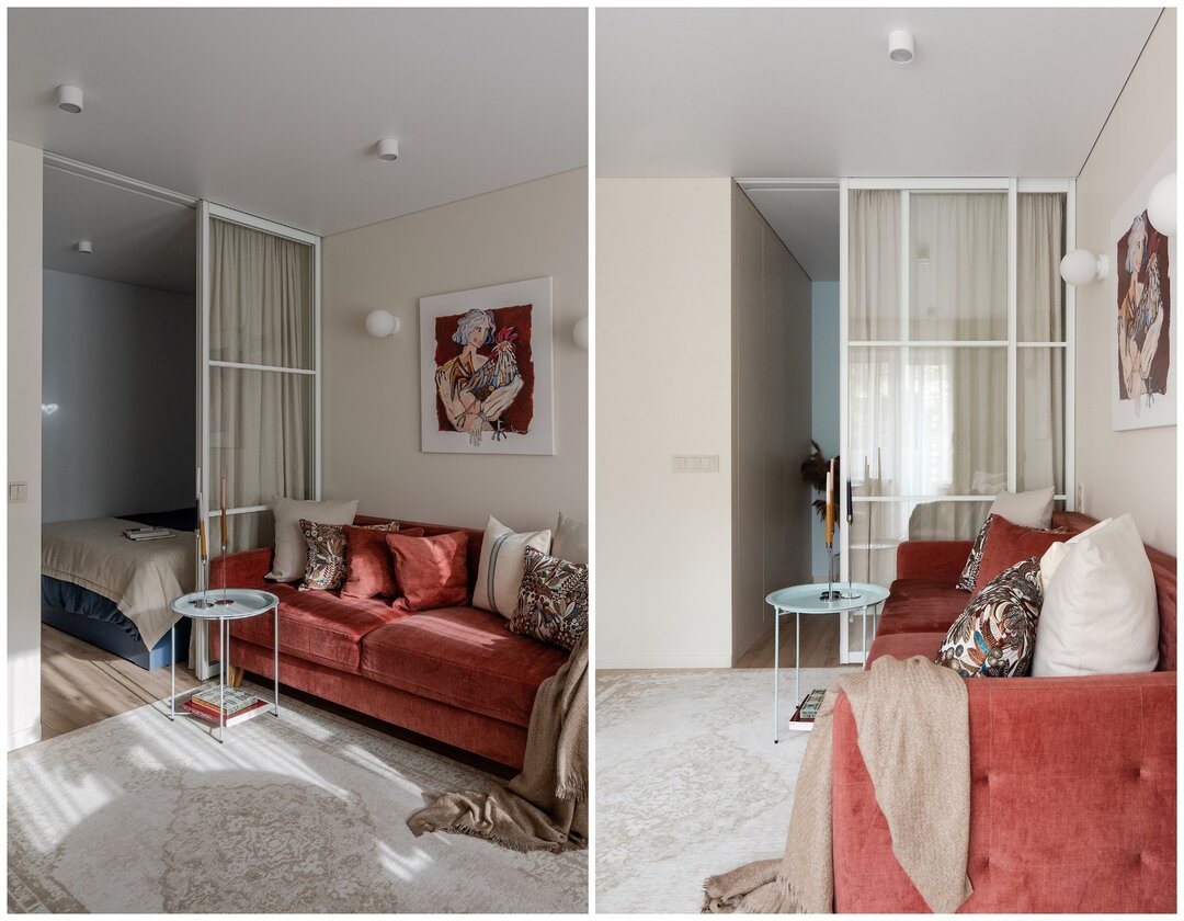 Дизайнер заложила возможность адаптации пространства под будущее: сейчас здесь одна рабочая зона у окна, но планировкой предусмотрено место для второй — у другого окна. Установлена кровать с дополнительным спальным местом.