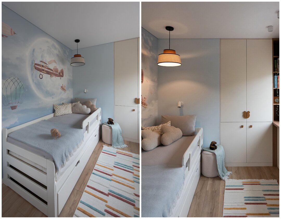 В детской тоже есть фреска. На этот раз использовали бесшовные обои от белорусского производителя Vinni.by. Рисунок ребенок выбирал сам.