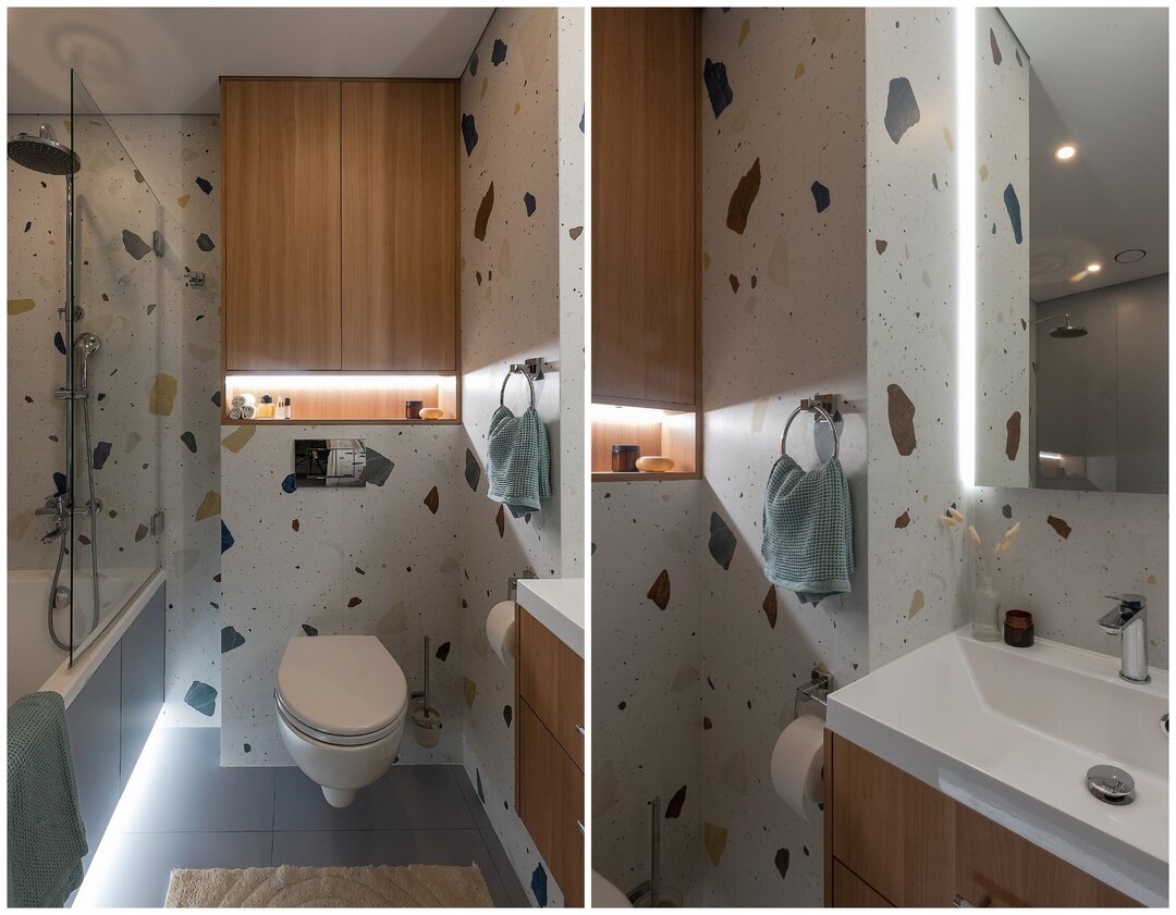 По концепции санузел должен давать ощущение чистоты и свежести, но при этом добавить тепла. Поэтому выбрали мягкий голубой оттенок плитки в сочетании с крупным терраццо и терракотовыми акцентами. Голубую плитку решили продлить и в прихожую, обозначив таким образом грязную зону, и визуально связав оба пространства.