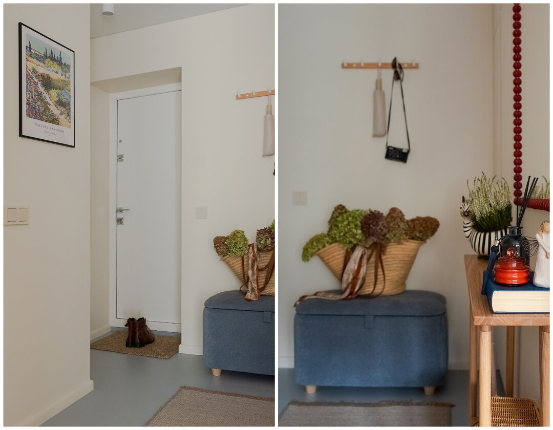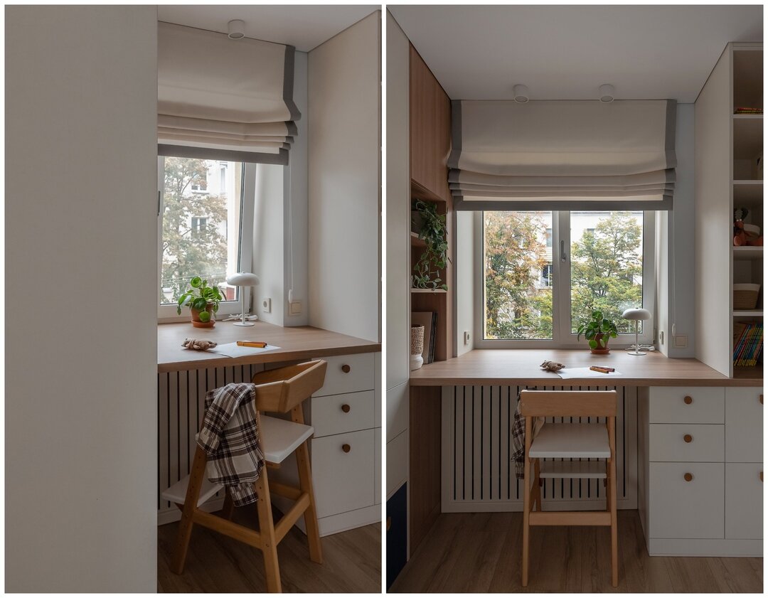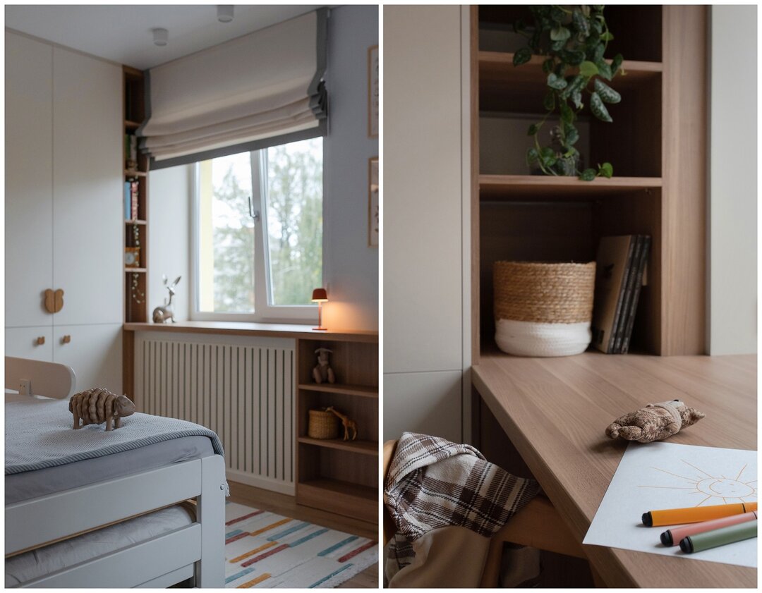 Системы хранения Ирина называет одной из сильных сторон проекта. В квартире действительно удалось разместить все необходимое без ощущения перегруженности. Встроенная мебель выполнена на заказ из ЛДСП. В прихожей справа от входа нашлось место для обувницы глубиной всего 25−30 см. Узкая, но, по словам дизайнера, в ней разместилась почти вся обувь семьи, так как полки делали под углом. Слева-шкаф для верхней одежды. В нижней части предусмотрено место под базу робота-пылесоса. Там же спрятан отдельный шкаф для стиральной машины и бытовых принадлежностей. Помимо шкафа для одежды в хозяйской спальне, есть места и под кроватью-подиумом. Там разместились места хранения с подъемным механизмом и выдвижные ящики. В детской функциональных зон больше всего: шкафы, открытые полки и стеллажи. На балконе обустроен глубокий шкаф для крупногабаритных вещей (санки, консервация) и мягкое сиденье с внутренним ящиком для хранения- летом тут здорово посидеть с чашечкой чая.