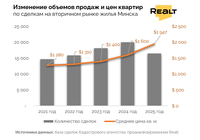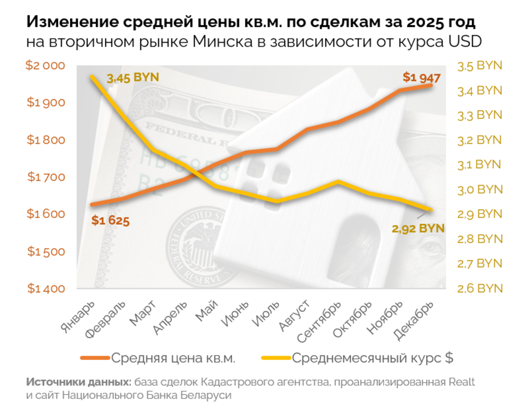 Все просто — снизившийся за прошлый год на 17% обменный курс доллара, сделал квартиры для покупателей дешевле и позволил ценам так сильно вырасти. Поэтому если от 22% роста цен отнять 17% снижение курса доллара, то получим «чистое» подорожание квартир в Минске за 2025 год всего на 5%.