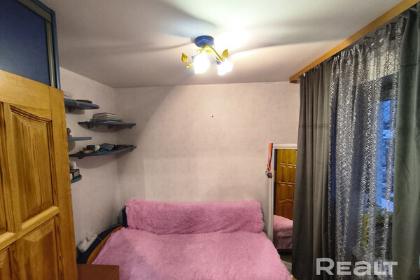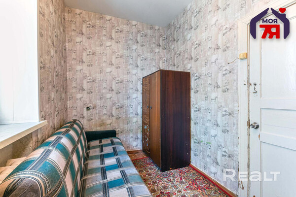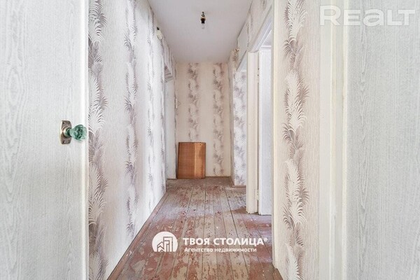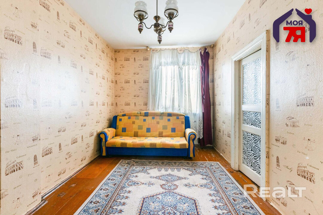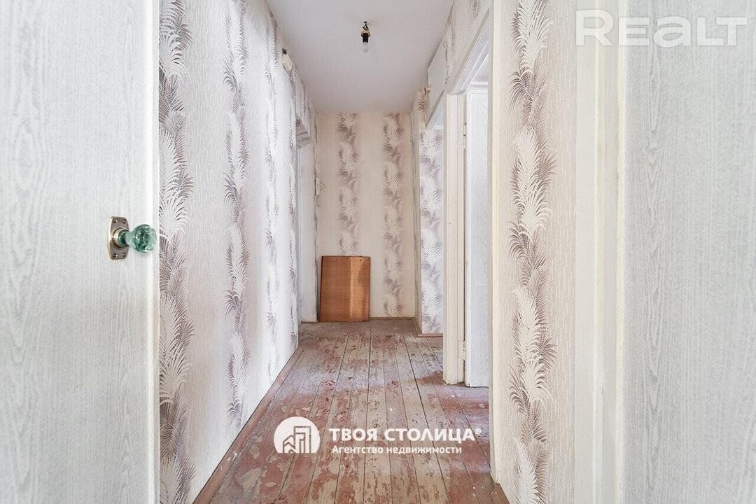 Двушка выглядит аккуратной, хоть некоторые детали и требуют обновления. Окна со стеклопакетами, лежат деревянные полы, стены оклеены обоями. Одна из комнат — проходная. Балкона нет. Во дворе есть хозпостройка.