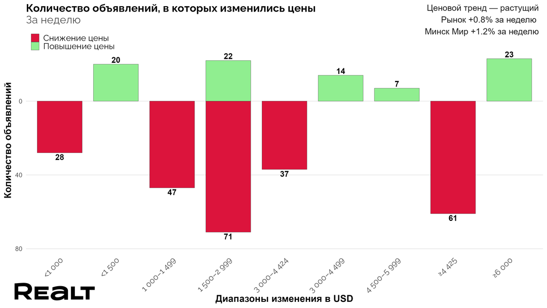 В результате, средняя цена квадрата в объявлениях по всему Минску, за прошедшую неделю увеличилась на 0.8% до уровня 2195 $/м2. А в Минск-Мире увеличение составило 1.2%, и на данный момент составляет уже 2240 $/м2.