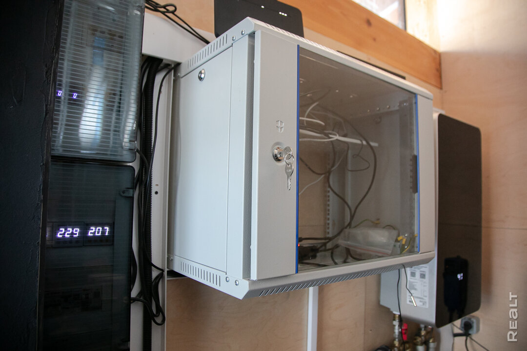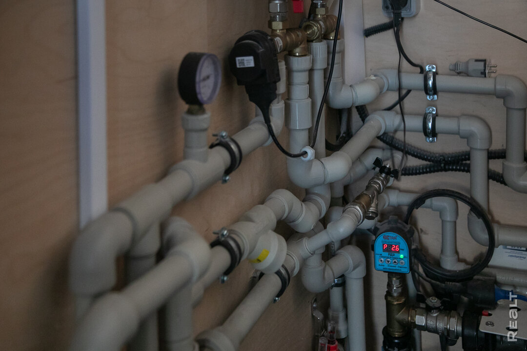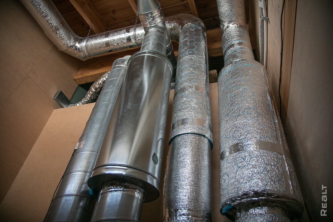 В топочной, вход в которую спрятан за кухней, кроме стандартного набора оборудования, внимание привлек большой металлический ящик с отходящими от него трубами. Это приточно-вытяжная вентиляция с рекуперацией. Александр говорит, что модель подбиралась по точным расчетам: по объему воздуха, количеству проживающих и так далее.